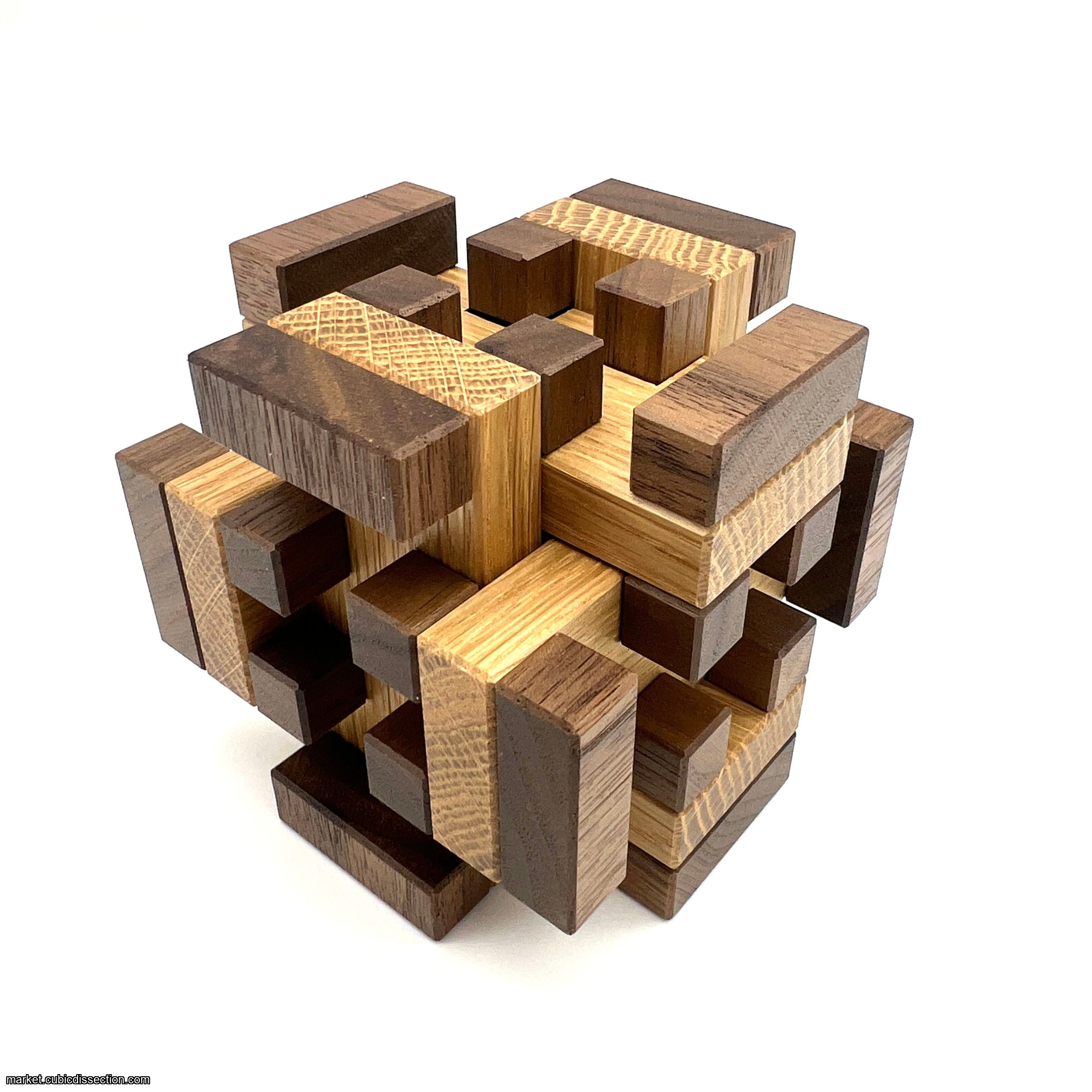 We have made two variants for this release, one with light white oak and rich walnut, and another with bright ash and intricate zebrawood. The wood pairings give each puzzle a visually pleasing contrast, with the large, chamfered pieces being easy to handle and providing very smooth movements.