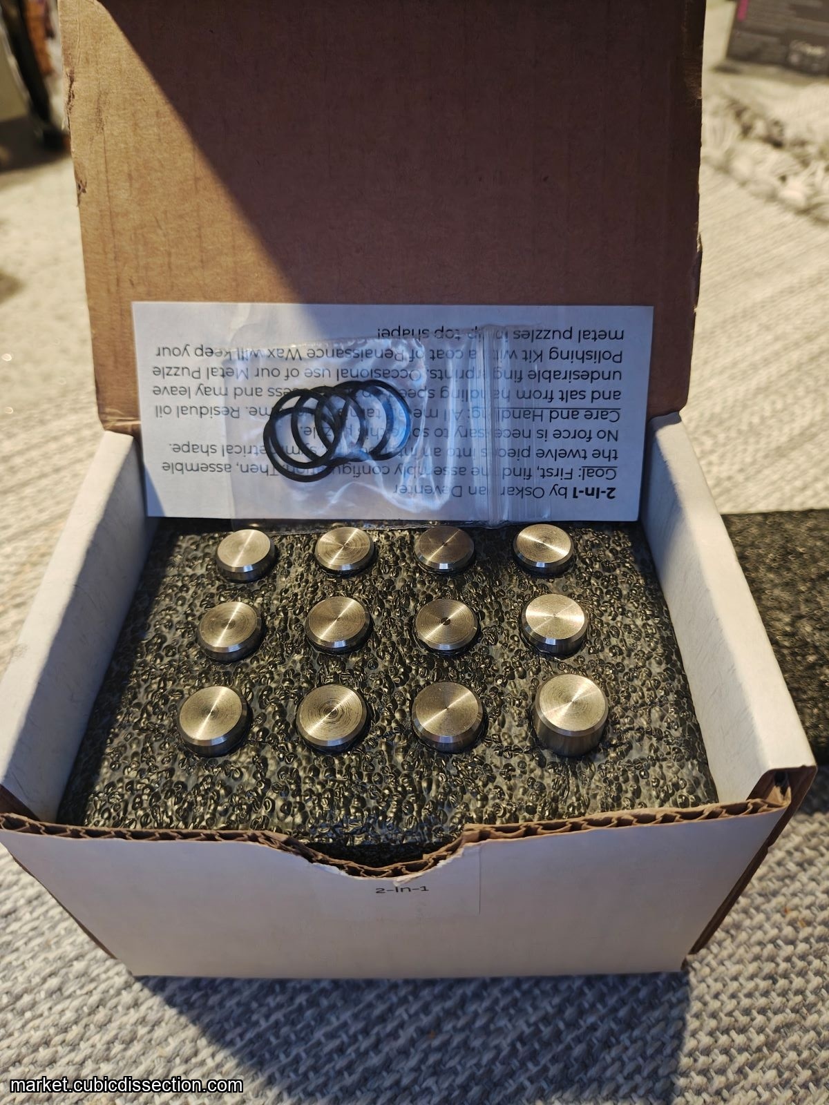 As shown by the previous releases we crafted from solid wood in its intended rectilinear form, 2-in-1 is one of our favorite burr puzzles. Eric recently had the idea to try the same assembly in precision milled round metal. The result is profound, a reinvention that adds significant difficulty and results in a beautiful, hefty metal sculpture. This puzzle ships unassembled. The solution is available upon request. This one is still in Box, opened, to check Contents. I have not removed or attempted to solve. The Pictures of the piece finished are from the Cubic Dissection original release from 6-2022 https://cubicdissection.com/collections/metal-puzzles/products/2-in-1-stainless-steel Starting Price is Original List Price. Shipping is $9.95 US. Overseas TBD Paypal is Accepted. Kindly Email any Questions. |