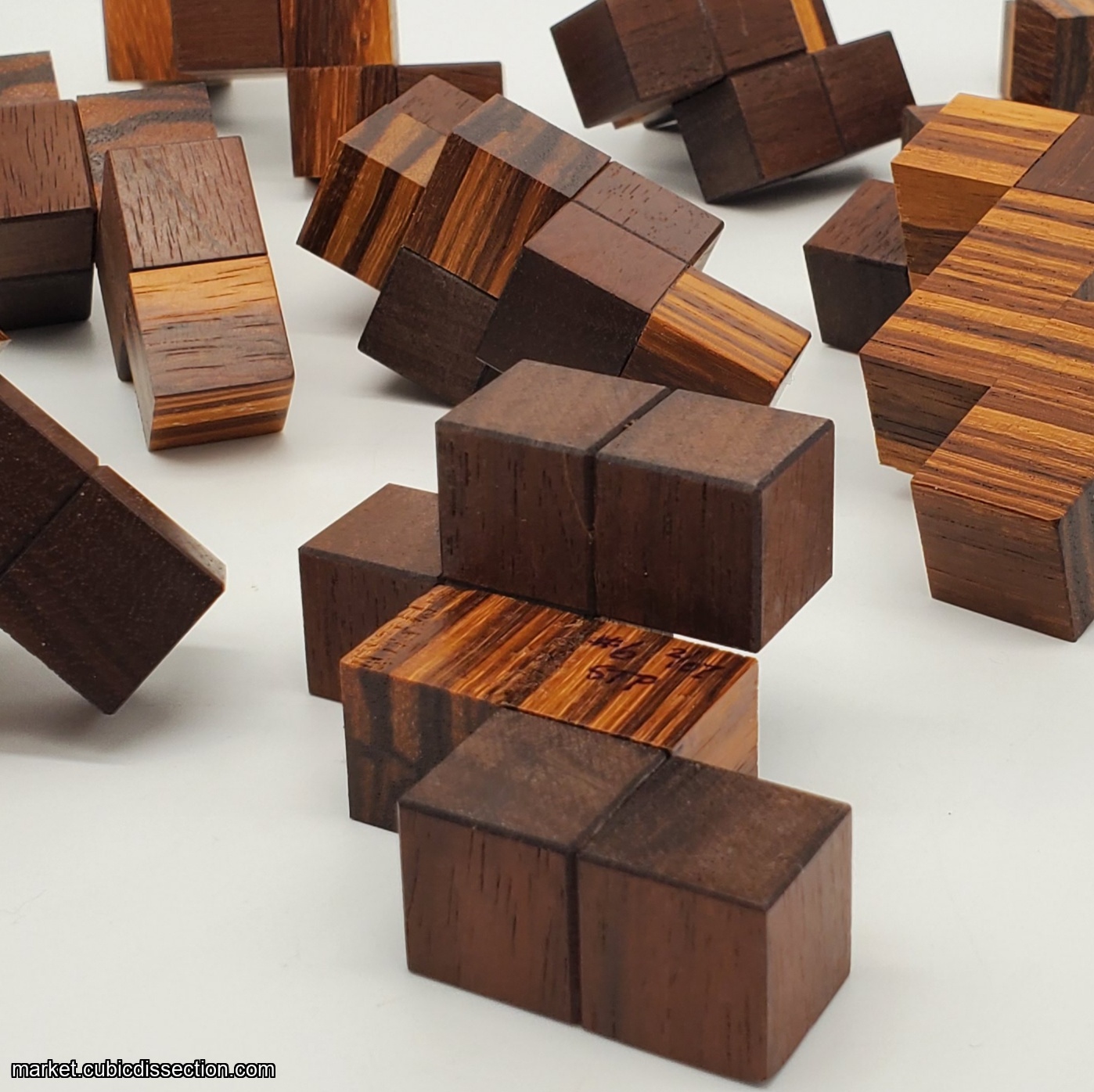 • description: designed by Rob Stegmann in 2003 and crafted here by Scott T. Peterson, this interlocking puzzle consists of eight pieces that assemble into a perfect 4×4×4 cube. Each piece is made from two n-tetrominoes, forming four color-matched pairs; Peterson’s Bocote version highlights the puzzle’s core theme of duality through the use of contrasting exotic woods and distinct face patterns that reflect the geometric symmetry of the design.