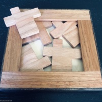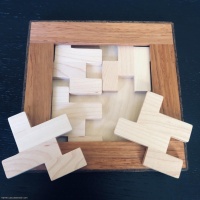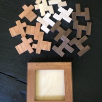 The puzzles consist of three sets of five identical pieces. The tray has a circumferential lip, allowing a portion of individual pieces to slide under it. The goal is to fit all five of each wood style.