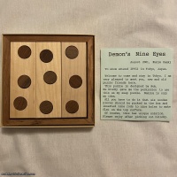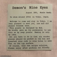 Demon's Nine Eyes --- Designed by Nob, produced by Woodpecker Hikimi, exchanged by Kuneo Saeki. The six wooden pieces have to be packed into the tray such that the nine cylinders can be inserted into nine holes and be flush with the top. The solution is unique.