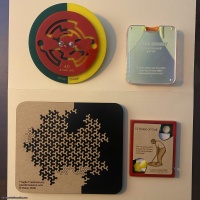 Boston Subway --- Dave Rossetti's exchange puzzle from IPP26 (Boston, 2006). This is another route-finding puzzle, a circuit maze made of a sandwich of 5 layers of clear acrylic with a tiny magnetic disk trapped inside (with horizontal and vertical channels in each level, and "elevators" through which the disk can be manipulated between levels), and a magnetic wand that can be used to drag the disk along the maze. The goal is to bring the disk to from home to work (trivial), and then back to home FROM work.