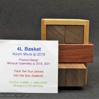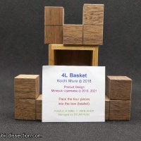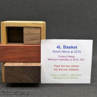 "I knew that 4L Basket was going to be fun - it had won the Puzzler's award as well as the Jury 1st prize at the Design competition in 2019 and I had a brief play with Allard's copy at the last MPP and failed to solve it after a ½ hour helping me decide that I definitely needed my own copy. I tried a few of the tricks from the 4L packing puzzle but that didn't help me at all - It was definitely going to be fun. The 4L Basket was a design by Koichi Miura who has also designed several others that I have reviewed and enjoyed. It has been beautifully made by Mine from Walnut, Oak and Padauk. Like the 4L there are 4 L-shaped pieces to be fitted into a box but this time the L's are all identical and simple Triominos, the box has 2 identical entry paths separated by the handle of the basket which cannot move and has 2 holes in the sides beneath the handle. I was able to work out a few possible ways to organize these pieces inside the 2x2x3 cavity - so how can you maneuver the pieces past the blockage caused by the handle? . . . the tolerances of the box are such that it is quite tough to find any possible rotations for anything other than the first piece."
