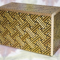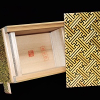 This box is from a group of 36 boxes that were made by the late Mr. Okiyama. The group of boxes I received from Japan were the finest boxes in the 5 sun 27 move size that I have ever seen from this great master. They are all very smooth in operation make the "pop" that a quality box will make as it is opened and is finished in a matt finish unlike many of Mr. Okiyama's boxes which have a more glossy appearance to their finish. These boxes are very rare, very beautful, operate perfectly and will be a treasure to add to any collection Approximate size of the box is 5.75" X 4" X 2.75" Kisaya is a yosegi that is overall a yellow and black design with more of the yellow enhancing the look and feel of this box.