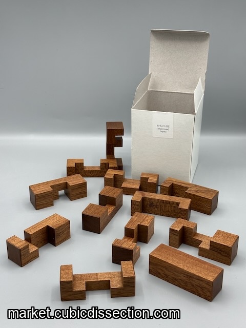 "6+6=CUBE Improved is a design dating back to 2007, Ishino's improvement of an original design 6+6=CUBE by Koji Kitajima. Twelve total pieces interlock to form either two solid notchable six-piece burrs or one twelve-piece cube.