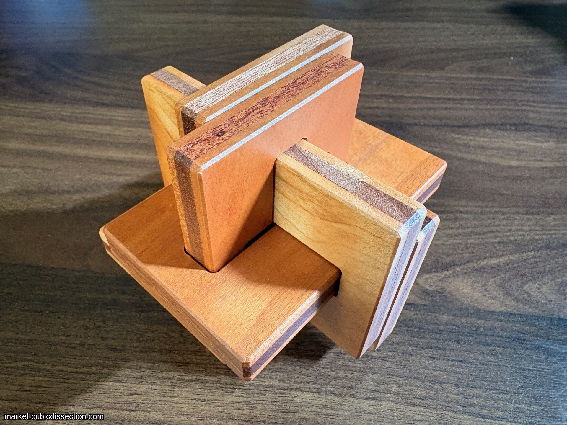 "This arduous board burr has a unique level 15-14-8-2-3 solution. After removing the first piece from the assembled shape, you still face another challenge to remove the second piece. At some point, a few pieces tend to rotate but a shortcut solution using rotational movement will not be possible for removing the first and the second pieces as Juno inspected by himself.