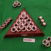 10 welded steel nut pieces in wood tray. Difficult and spatially challenging.  Goal: assemble a  5 × 5 × 5 pyramid on wooden base.  Base marked "AD-LT".