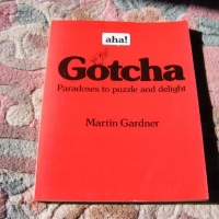 "aha! Gotcha" (Paradoxes to puzzle and delight) by Martin Gardner, paperback 1982 W.H. Freeman and Co. publishers. Very good condition, average wear. Some sun-fading on the spine.