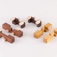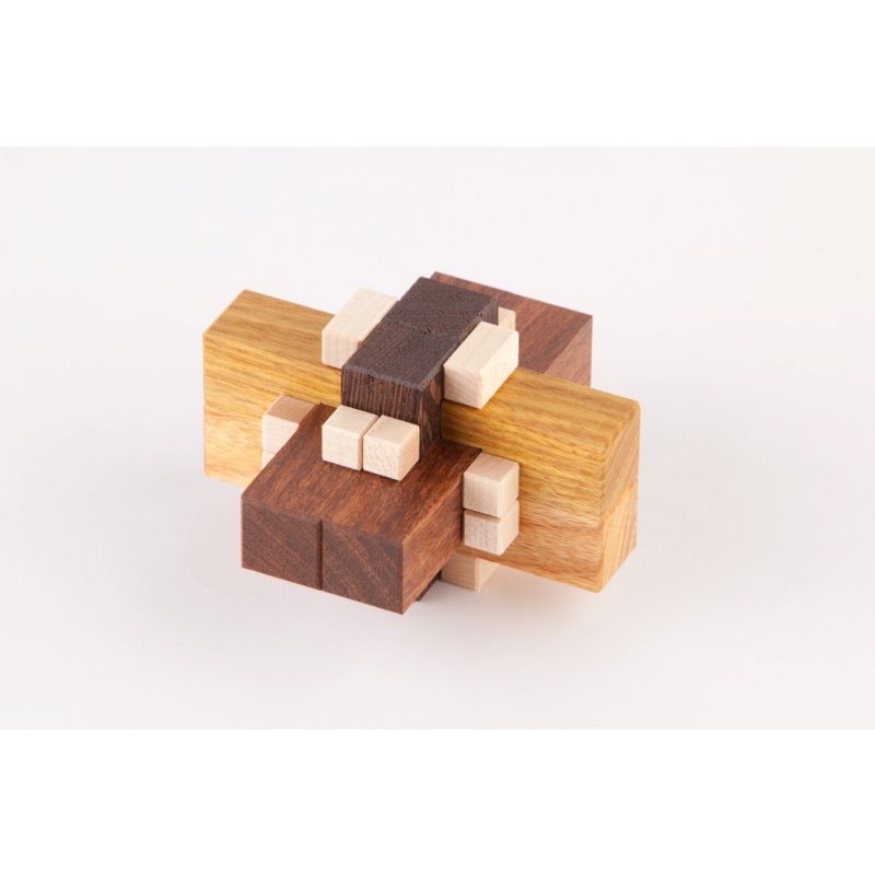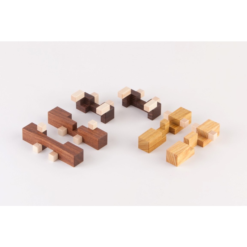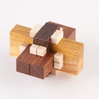 Cubicdissection.com description: "Amulet is a tricky and interesting variation on the standard six piece burr. To quote Allard's blog post about it: "He’s fiddled around with a standard six-piece burr and added a few constraining voxels around the middle and shorted one of the axes… adding those voxels makes all the difference it turns out – without them there’d be 144 solutions, with them the solution is unique… and quite tricky!"