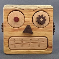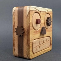Angry Walter is a multi-step sequential discovery puzzle. It's made from canarywood, cherry, Peruvian walnut, and padauk.