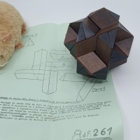 This is definitely a Scorpius puzzle. I *think* it is by Arjeu as it has an information sheet in French and the box has the name and number they used for this puzzle (Satellite CT49).  The six identical 4 stick pieces, each break down into individual sticks, with pins and holes holding them together.  The only reason I question whether it might actually be by Arjeu is that it has not been made in their usual woods. I assume it is an early puzzle by them.