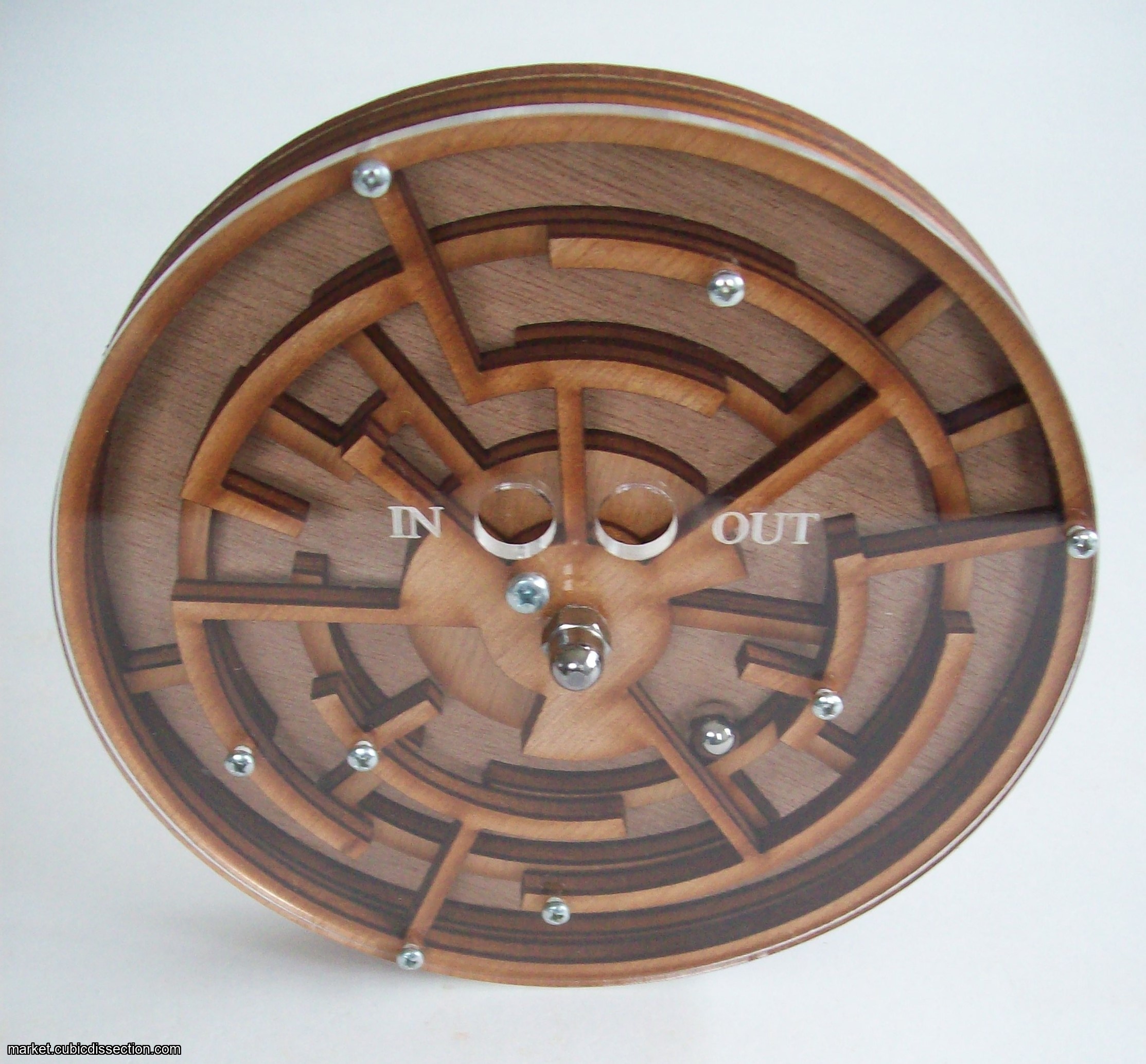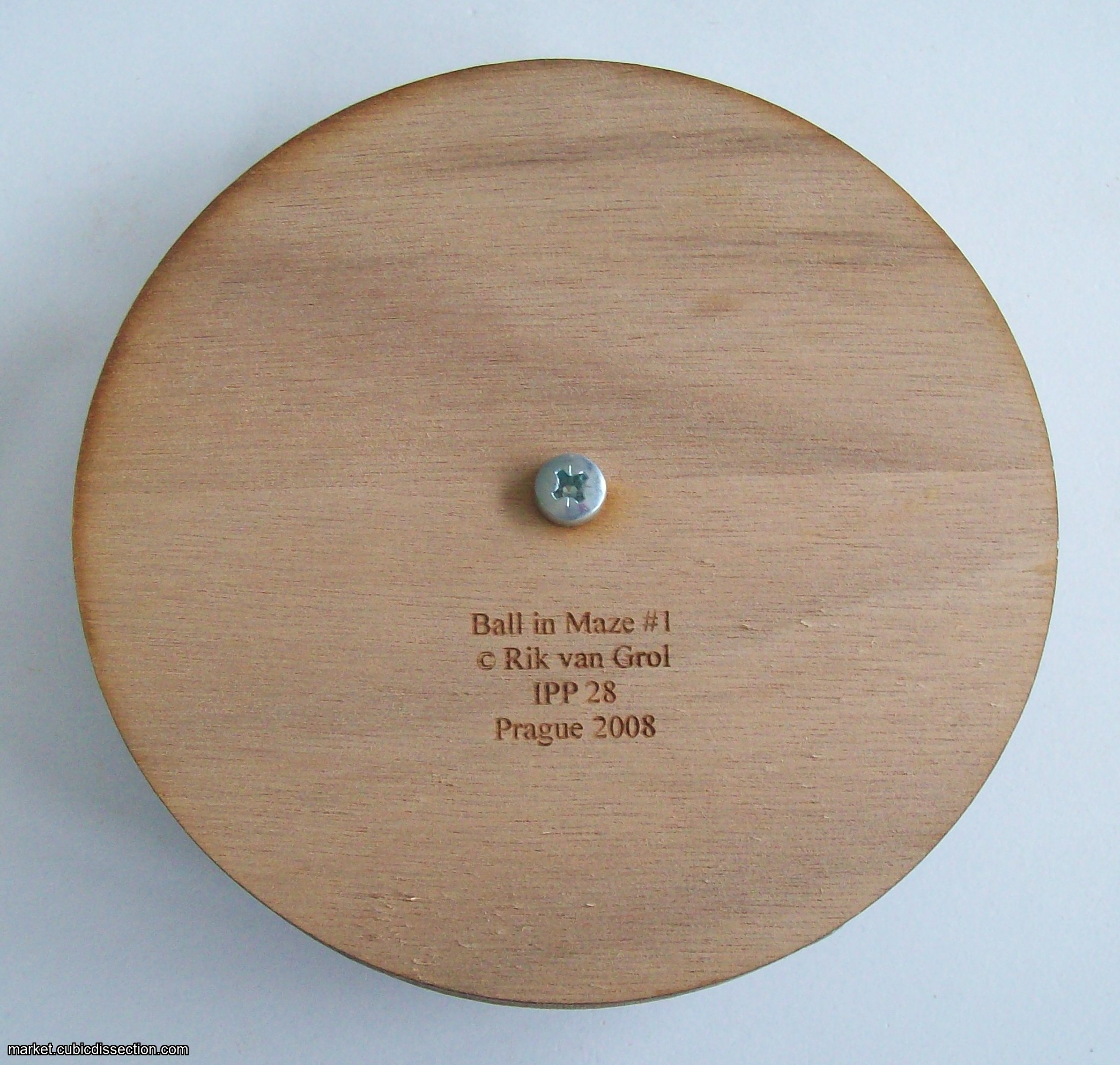 In winter 2008 I bought a similar puzzle, also made by Jean-Claude. In that puzzle the ball went in at the centre, like this one, but the ball went out at the edge. I thought the puzzle was fairly simple and wondered whether this could be improved. This puzzle is my attempt to make it more difficult.