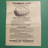 Bantam Eggs comes in its original box with original instructions. The colorful box shows some fading from over the past 65 years. The wood is frail from being so old, and there is a minor break in one piece that does not affect the assembly of the puzzle.