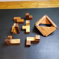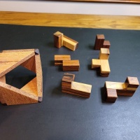 So here is another of Laszlo's great packing puzzles. This just seems too easy! Large triangular openings on both sides of the box should make this one a quick solve right? Wrong! If you like packing puzzles, you should give this a try. It is also a great puzzle to hand to a novice puzzler. By looking at it they will be confident they can solve it quickly. Then you can enjoy watching their frustration grow as they fight to find a solution.