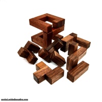 BioTic is a BEAST! 28 total moves and nine rotations are required to solve it. Designed by Andrew Crowell, these fascinating "Turning Interlocking Cubes" take it to the next level. Instead of straightforward linear moves, these designs require rotations during the solution process. Construction is outstanding, with shouldered joinery where side grain gluing is not possible, and detailed bevels which flow around the shouldered joints for a uniform appearance.