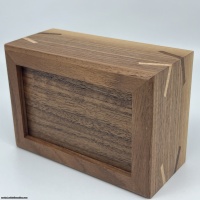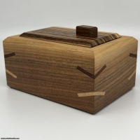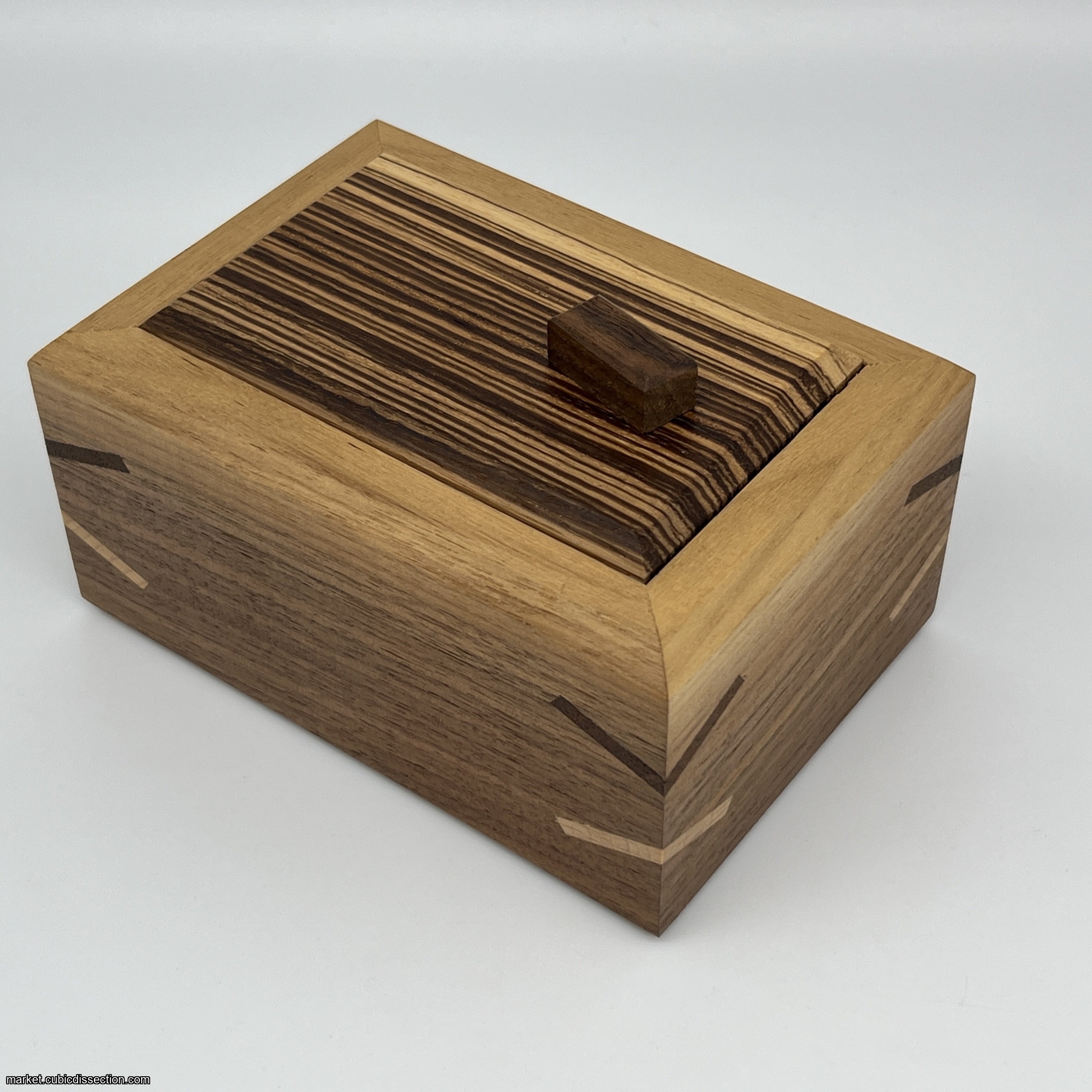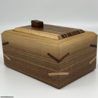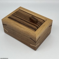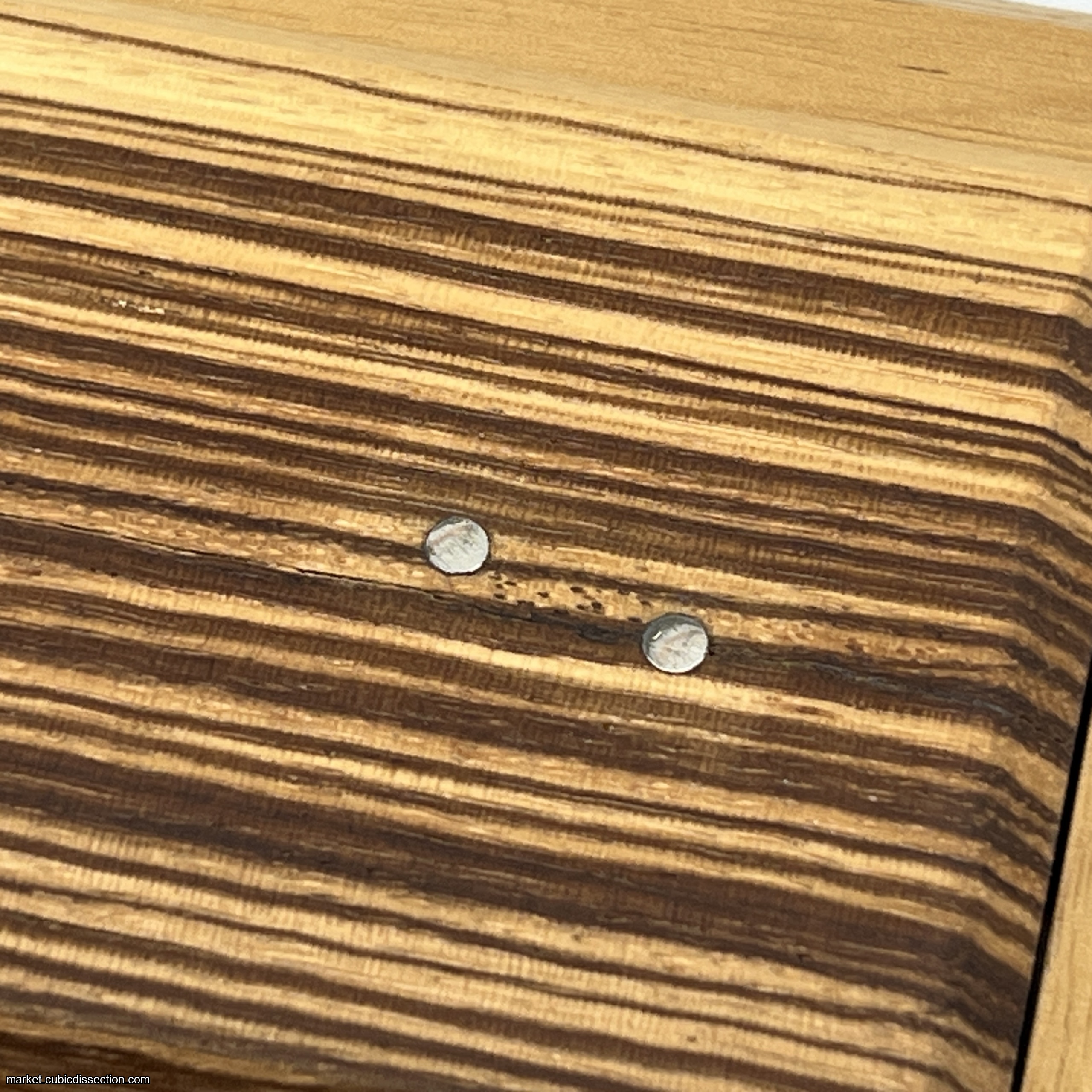 Blinded II is Dee's newest sequential discovery puzzle box. Crafted from zebrawood, and walnut, with angled spline keys to reinforce the miter joints. Development required multiple prototypes, resulting in a refined and unpredictable puzzle.  It measures 3.5" wide x 5" long x 3.5" high.  Putting items inside will interfere with the opening mechanism.