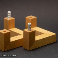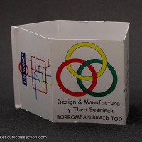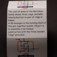 "The coat of arms of the Borromeo family shows three rings, mutually interlocked but no pair of rings is linked. A 3D-hexagon is the building block of this put-together puzzle. Object is to assemble a borromean construction with the three wooden "rings" provided."