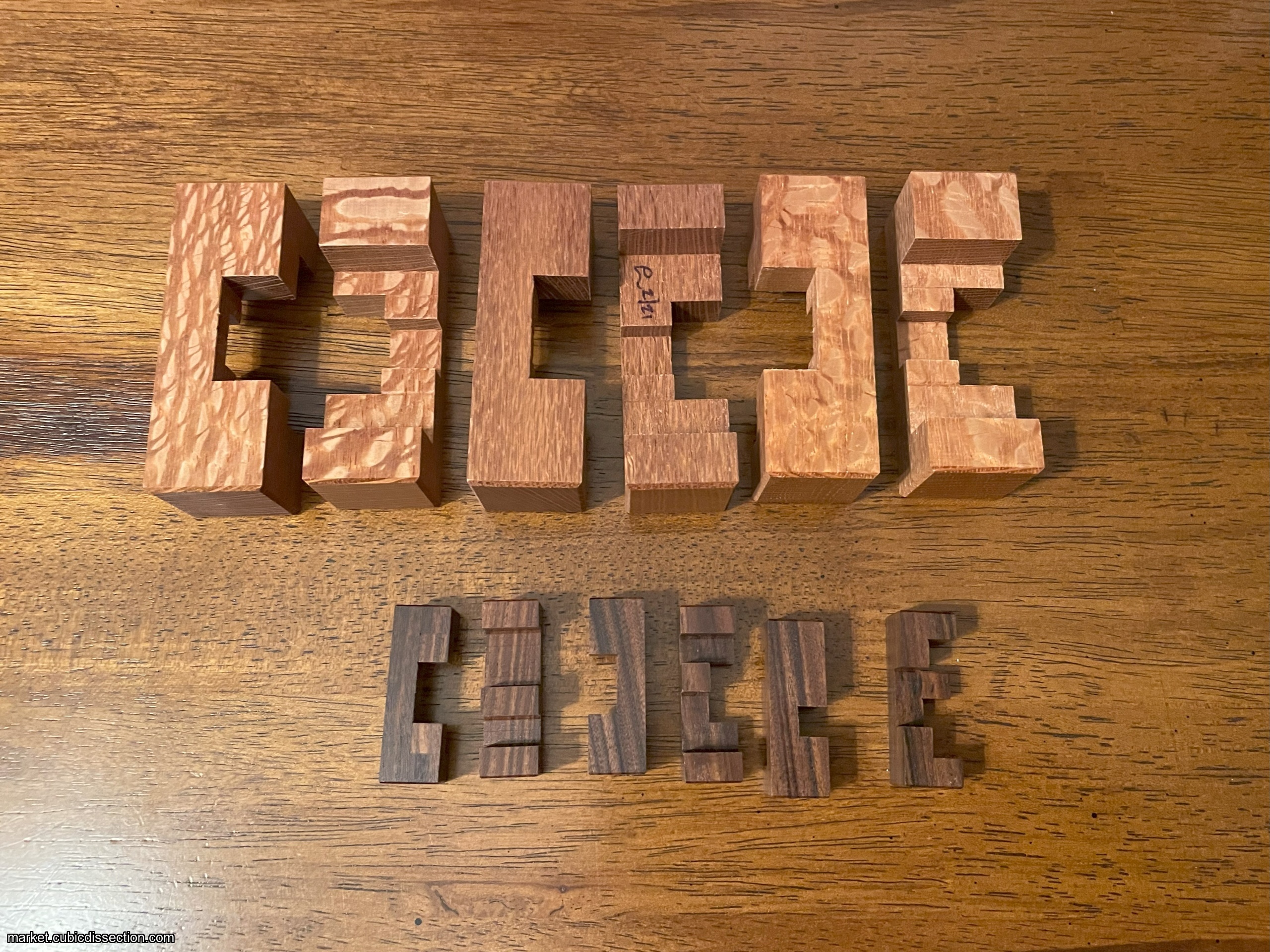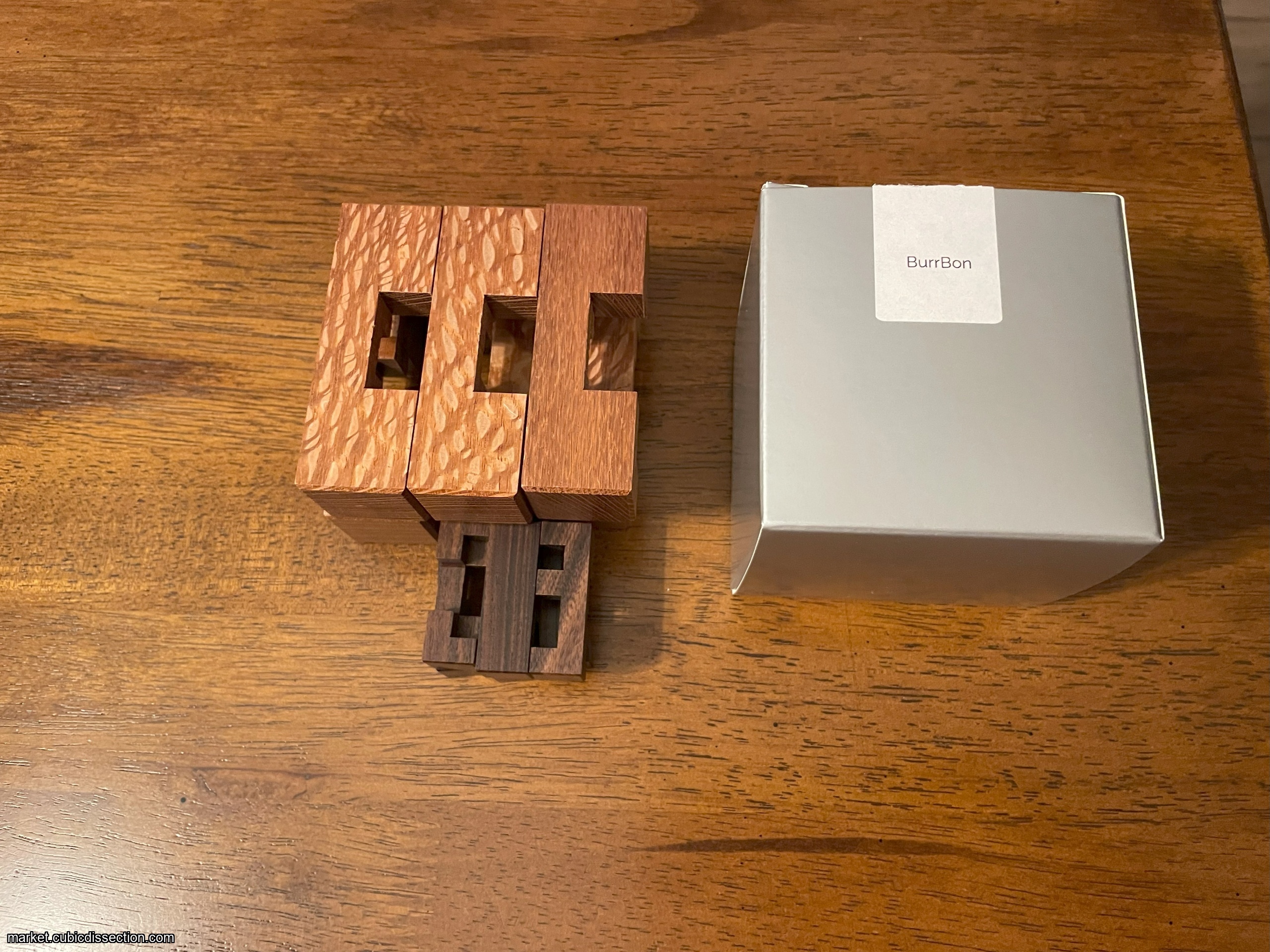The construction of BurrBon required just the right balance of tolerances to allow the inner burr to move smoothly. The simplicity of the pieces does not sufficiently reflect how much trial and error went into making it. The end result is sublime, with the dense and heavy internal Morado pieces floating into place inside the beautiful outer Lacewood.