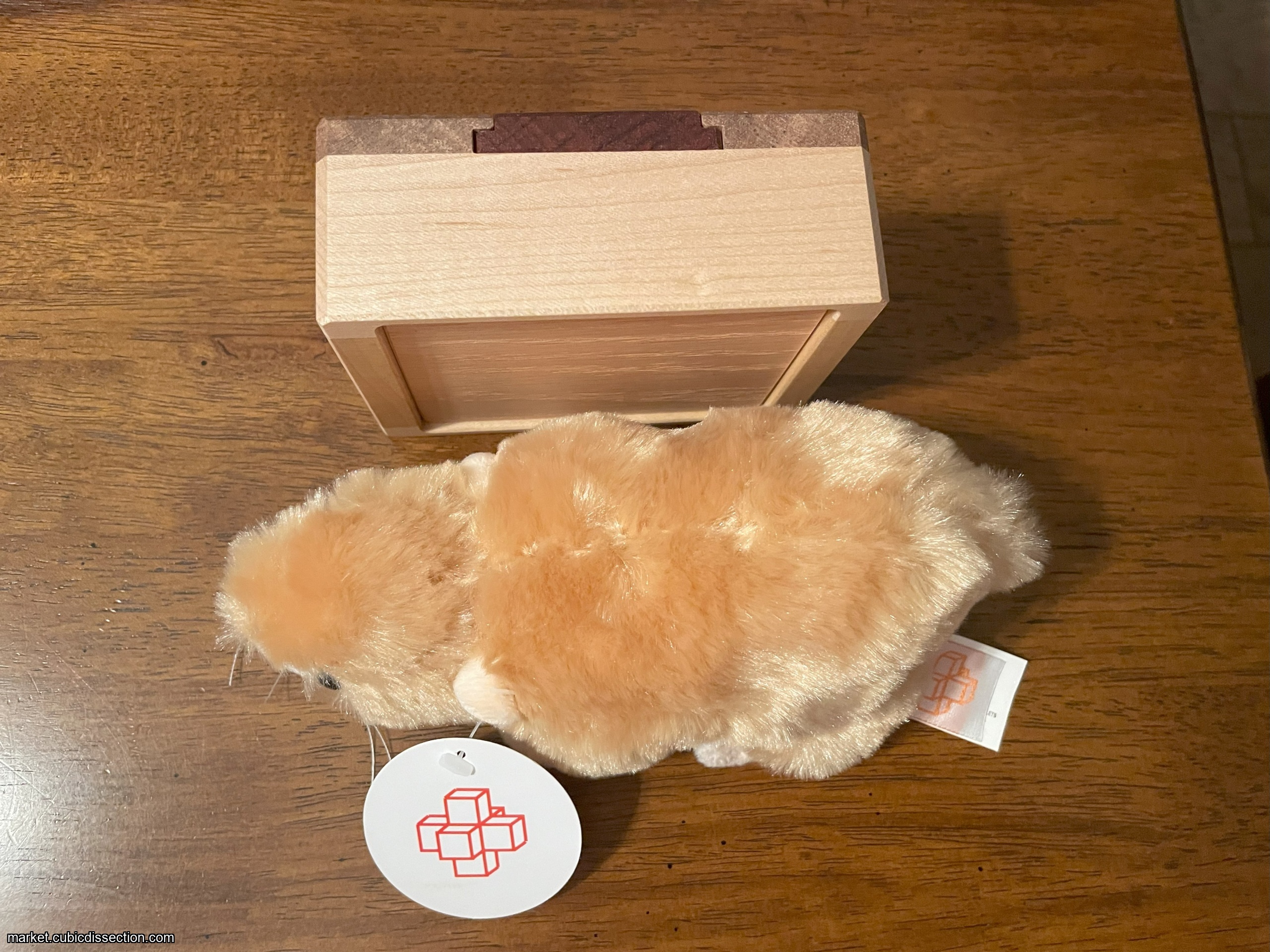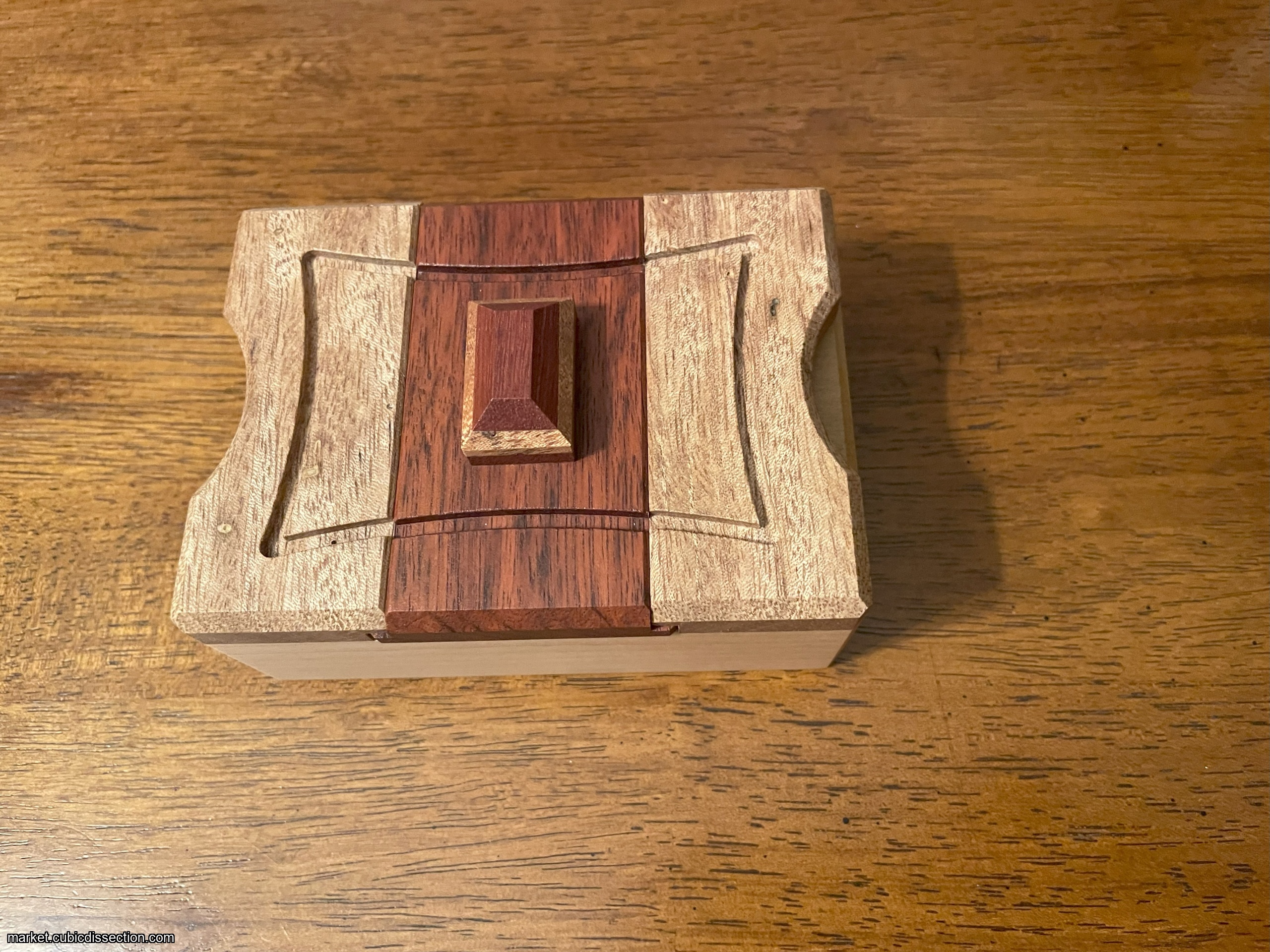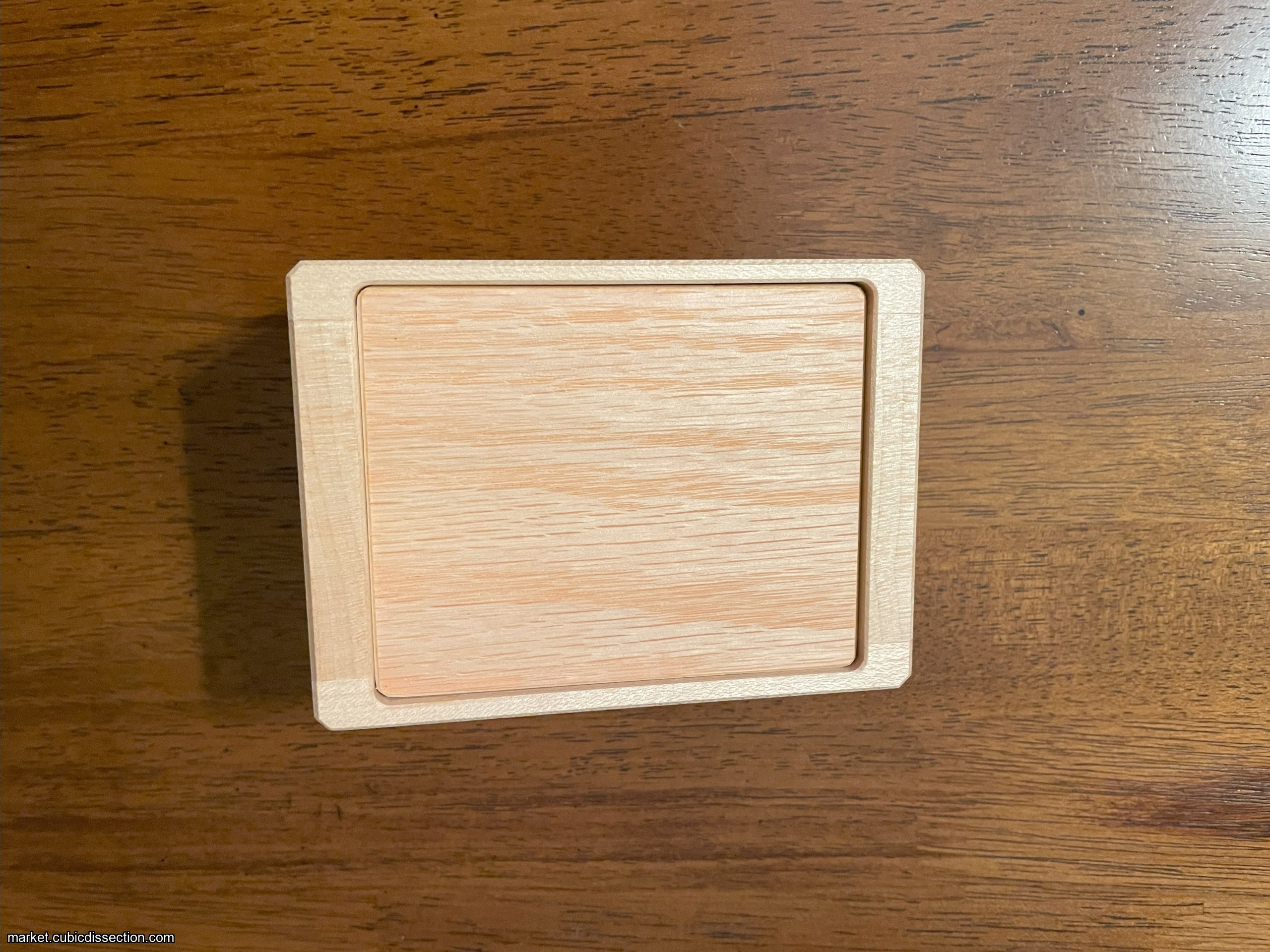 This puzzle box is sized to hold a regular-sized credit card. Its size is 85.6 x 53.98 mm or 3.37 x 2.125 inches, so it can also be used as a gift box containing a gift card and so on. This puzzle can be classified as a hidden maze-type puzzle box, but as you play with it, you will be able to partially see the hidden paths and reach the goal if you persevere in your efforts. As you begin to play, you will notice that there is more than one challenge to the puzzle. One of them is a bit more subtle: removing the red-colored slider at the top without using an external tool. Unlike most of our puzzle products, the solution to the box is not provided. Instead, you can easily cheat, and you will be able to access the maze diagram hidden in the box. You don't have to use force to play with the puzzle, even in case you are going to cheat. No bashing or violent shaking is needed. The top layer of the puzzle, including the knob, is made of Jarrah and sap wood of Bubinga, both of which have very distinctive textures. American Rock Maple was used for the main part of the box frame and Golden Sassafras for the maze area, which has good workability with a CNC router. |