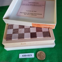 Checkerboard by Nob Yoshigahara consists of 9 pieces that form a checkerboard inside a tray. The object is to arrange the pieces in a 7x7 square tray in checkerboard pattern. Side of tray is embossed "Nob Puzzland Hikimi"