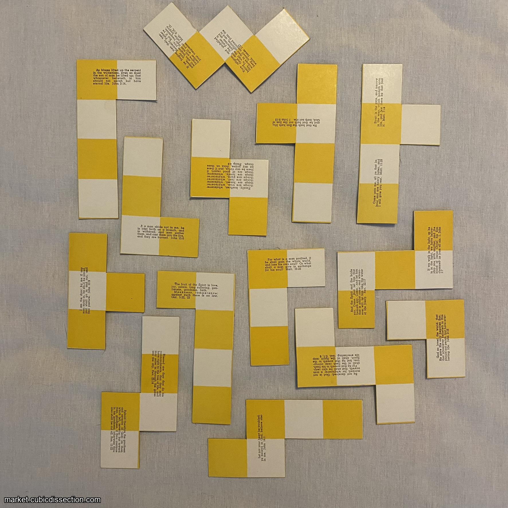 The Checkerboard Puzzle by the Strombeck Press in Moline Illinois is an unusual 14-piece checkerboard puzzle in that a) the checkered pieces are white and yellow, and b) the pieces contain text from scripture (!). Based on other Strombeck Press puzzles, the Checkerboard Puzzle dates from 1941, making it 82 years old! Both the container and pieces are in SUPERB condition. The puzzle has 84 solutions, and I will included a sealed copy of 14 of the solutions from the great Jacques Haubrich's A Century of Checkerboard Puzzles.