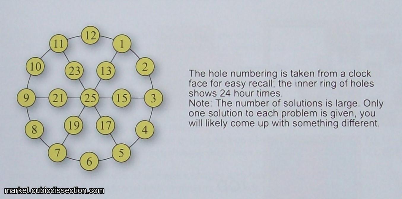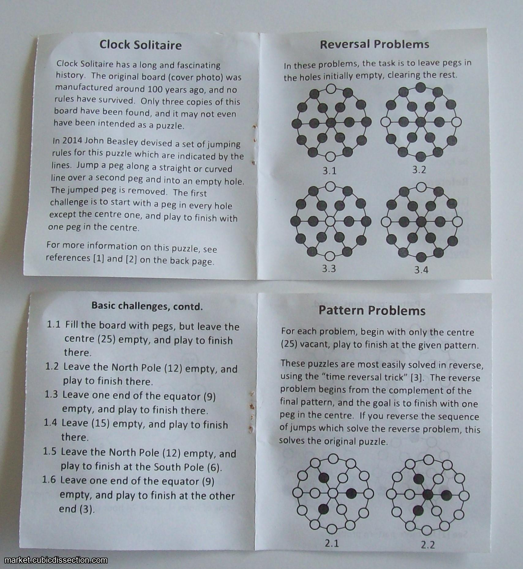 Jump with pegs, remove the jumped peg, and finish with one, as discribed in the booklet – 18 challenges.