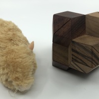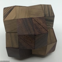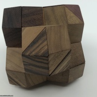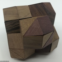 I have been unable to absolutely confirm the maker but I believe it may be Coffin or an early Pelikan based on the size.  The fit is good, a little snug, but that benefits this puzzle as the main challenge is to take apart the six identically shaped pieces.  It has been made with six different hardwoods and, after photographing this one, I have reassembled it so that all woods align. There are some minor gaps apparent between pieces the pictures and lighting do emphasise these making them look a little more substantial than they are.