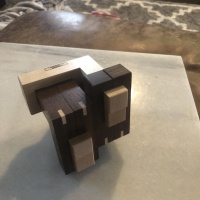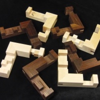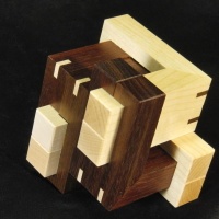 Cubicdissection.com description: "I love unusual burr puzzles, and the shape of Cobalt immediately grabbed me. I hadn't seen one that looked anything like it before. After checking out the design and solution, I was doubly impressed. The tricky level 12.8 solution is made even more difficult by the unfamiliar interactions between pieces bent at 90 degrees. I decided to make it from two contrasting woods, mostly for the looks but also to give a bit of a hint to the solver.
