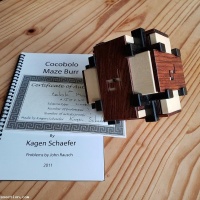 The Cocobolo Puzzle is  an evolved version of the Maze Burr awarded "Puzzle Of The Year" in 2006. It differs from the original in that, it is an actual box and does not disassemble into the notched sticks. When this is unlocked it functions as a solid box.