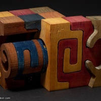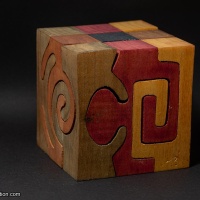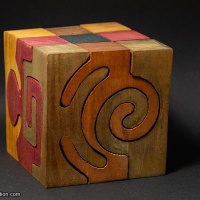 It is an interlocking puzzle with 9 different pieces. It's made out of wood (which is colored?).