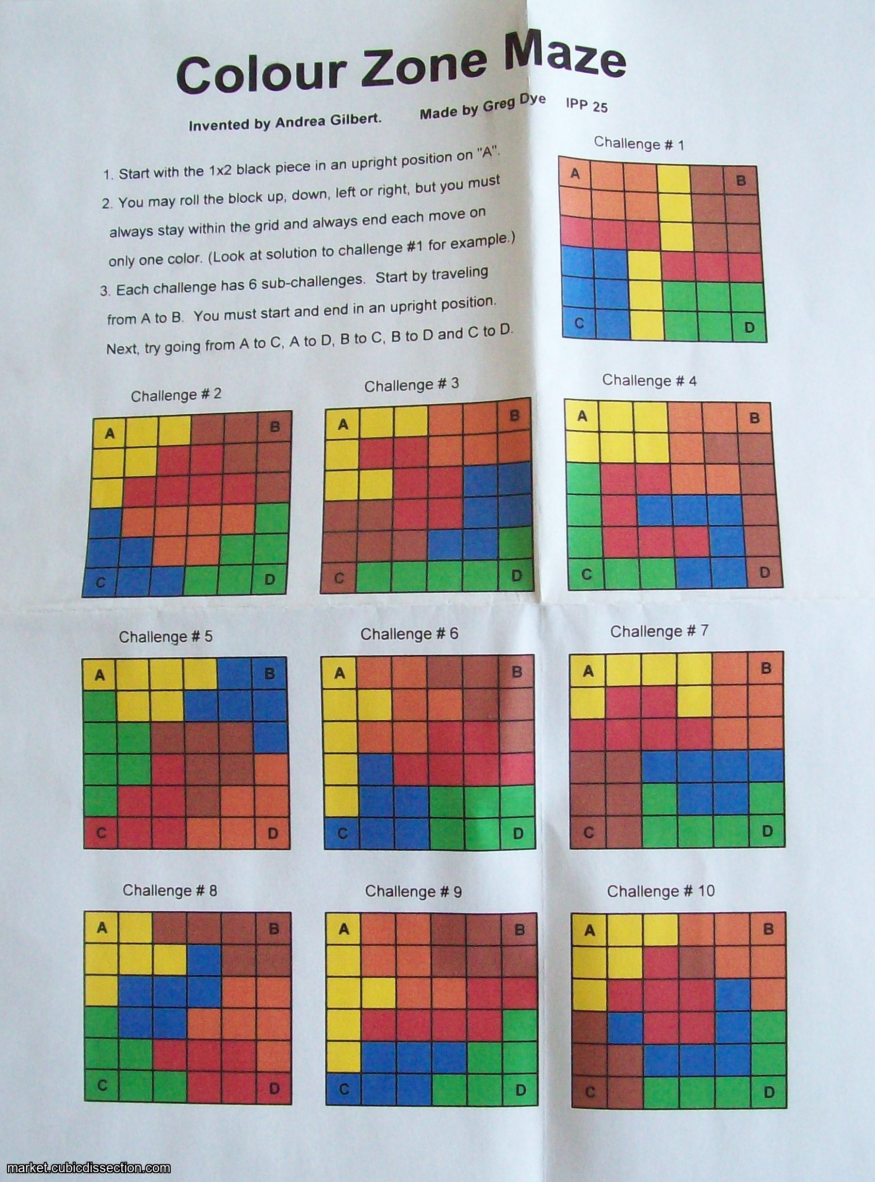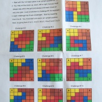 2. You may roll the block up, down, left or right, but you must always stay within the grid and always end each move on only one colour. (Look at solution to challenge #1 for example.)