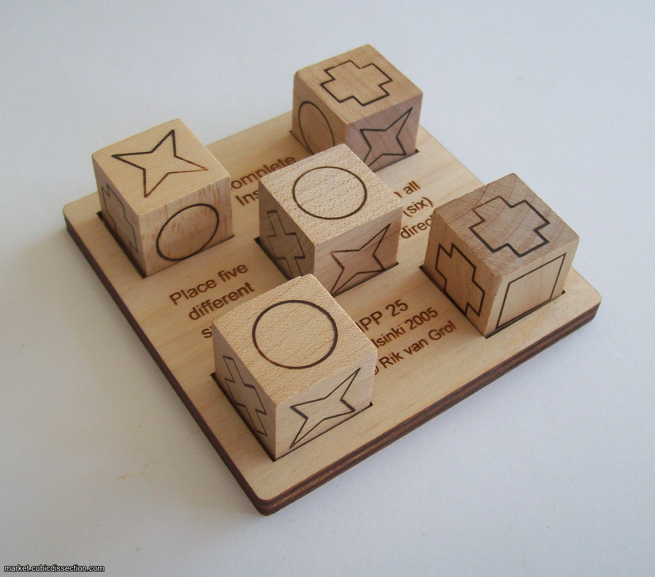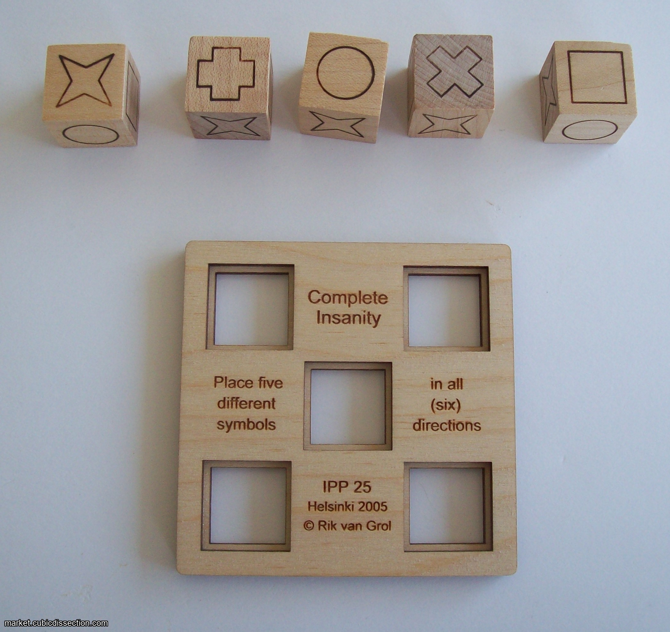 The object of Complete Insanity is to place the five cubes in the base in such a way that from all (six) directions you see five different symbols.