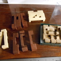 Condor's Peeper, designed Jack Krijnen, made by Mr Puzzle. Highest unique 18 piece burr with notchable pieces. Unassembled. Made from Virtec, Jarrah, and Silver Ash woods. A couple of the jarrah pieces have a tiny hole in them, but they came that way; probably an insect bore-hole originally.