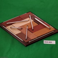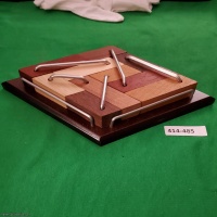 10 pcs (ea a diff exotic wood!!) and 5 "wicket" pegs in wood tray form a quadrilateral shape. Wood tray with aluminum rails. Goal: fill tray with sticks and wickets. Could be a sticky wicket...