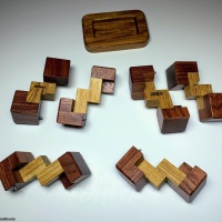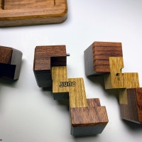 When Juno was preparing the Koto timber stocks that are used for the original versions of Crooked 6 Piece Burr, he found distinct color variances to the Koto timber that is used for the lighter color part. He didn't want to mix different color timber to the same puzzle so he decided to use darker Koto timber for the different kind of the puzzle. The coordinated motion version of the puzzle that he designed 29 years ago was too much work to make, thus he newly designed the puzzle and decided to produce this pinned and grooved versions.