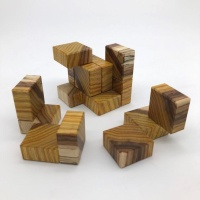 Cube Sixteen is one of Coffin's more obscure designs but is nonetheless a delightful puzzle. Five unique pieces serially interlock with one possible solution. It's much more difficult than you might expect; even disassembly can be tricky. Crafted of some of the nicest canarywood and rosewood I've found in a while, it displays well with a lovely symmetrical appearance.