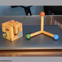 Culax --- CUbe Labyrinth AXes --- was designed by the late great Markus Götz of Germany, and was Markus' exchange puzzle at the 23rd International Puzzle Party (IPP23) held in Chicago in 2003.  In Markus' words, "This puzzle consists of two pieces:  a cube and an axis of coordinates.  The cube itself consists of square rods presenting a maze.  Three of its outer faces have been given colored marks, which uniquely identify the position of the axes of coordinates inside of the cube, by matching the marks with the colored balls.  The objective is to put the axes into the cube so that the rods come from the inside to the outside at the position marked with the colors, matching the colors of the balls."