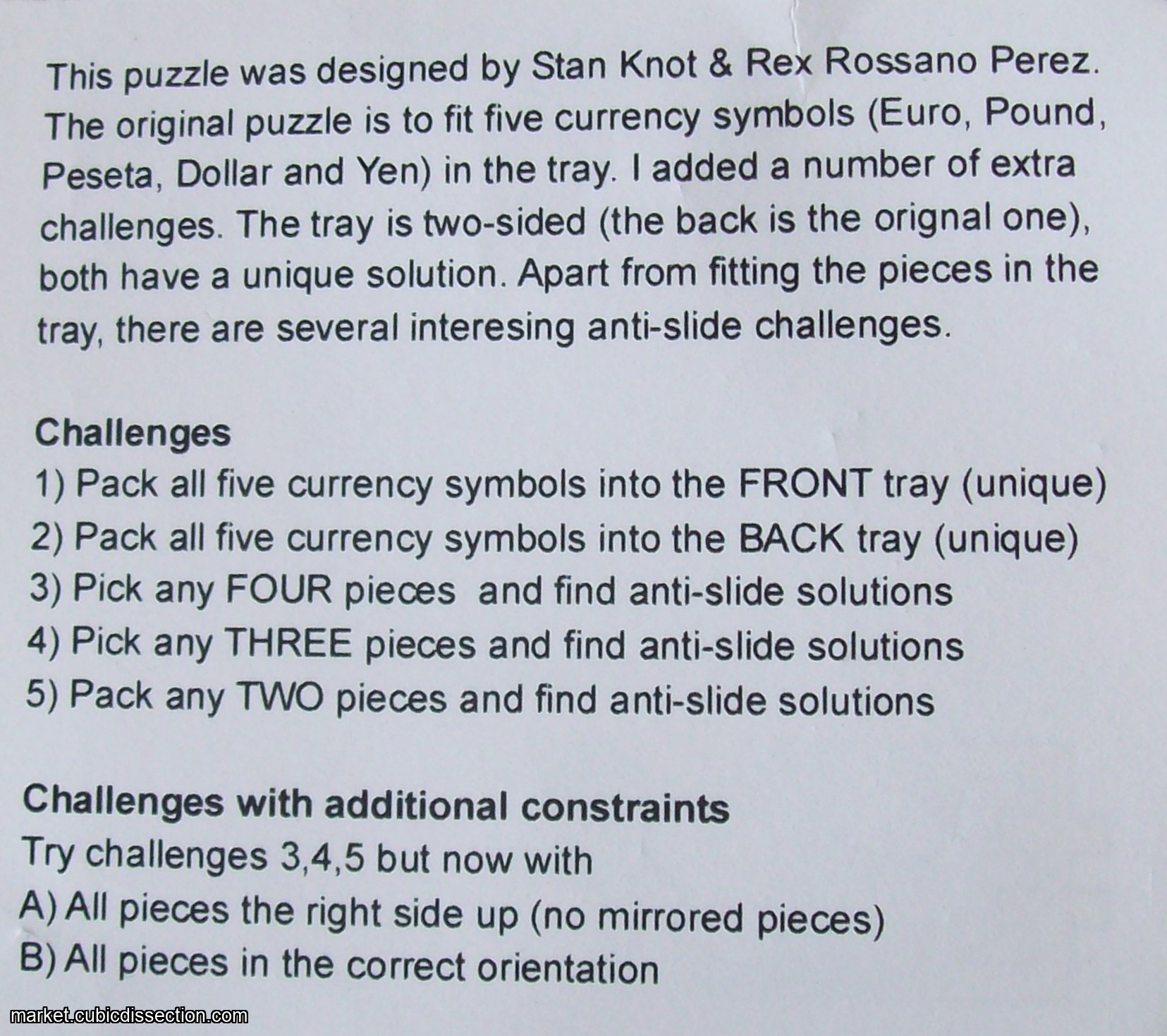 1) Pack all five currency symbols into the FRONT tray (unique solution).