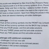 2) Pack all five currency symbols into the BACK tray (unique solution).