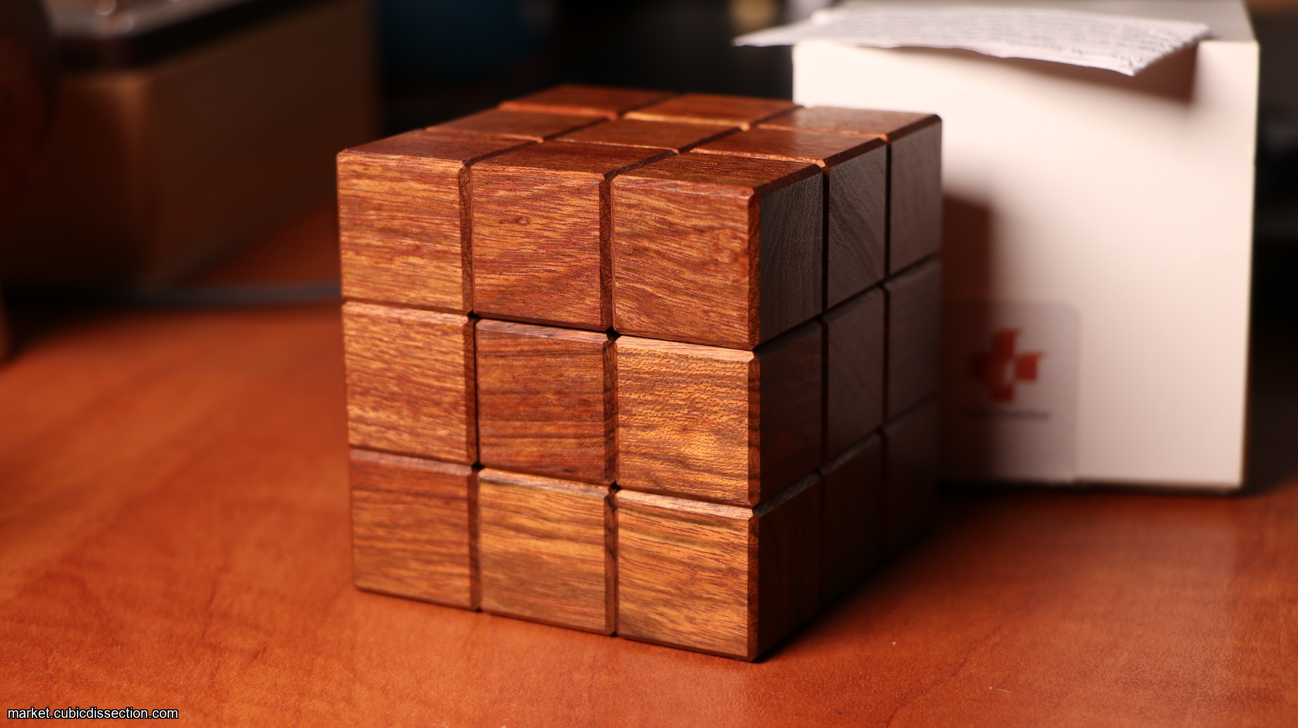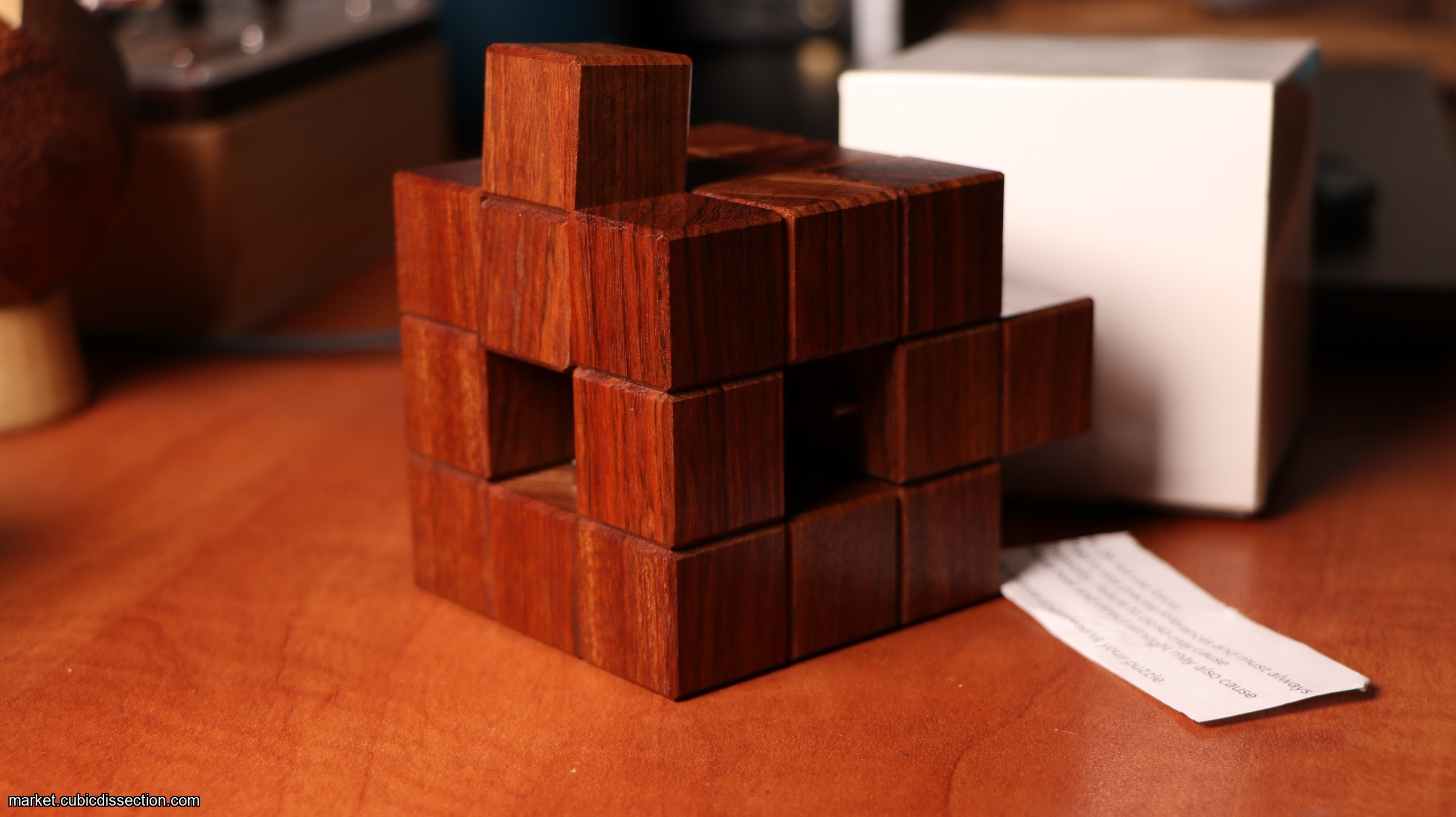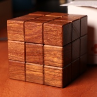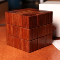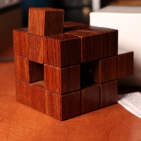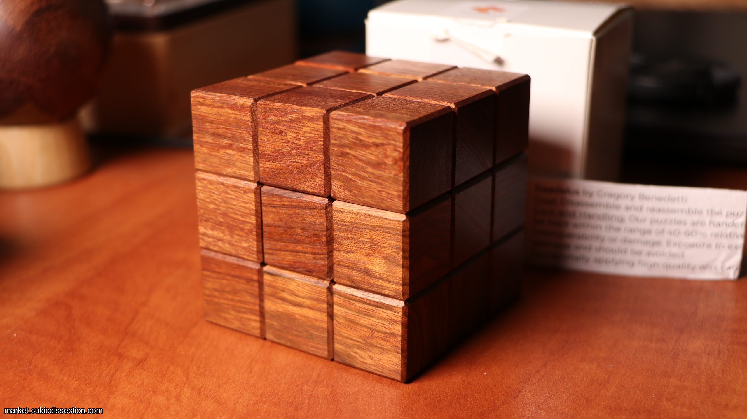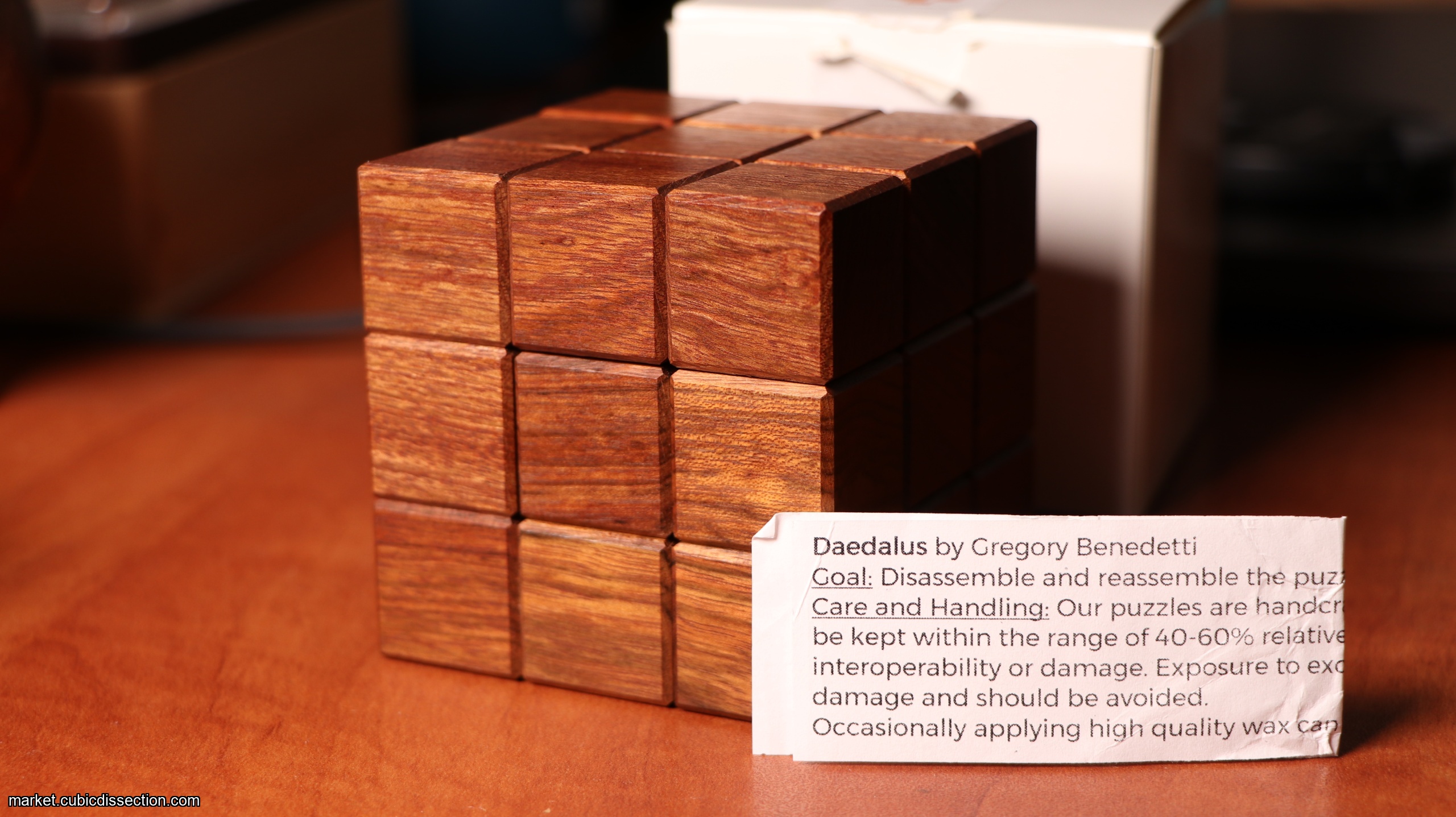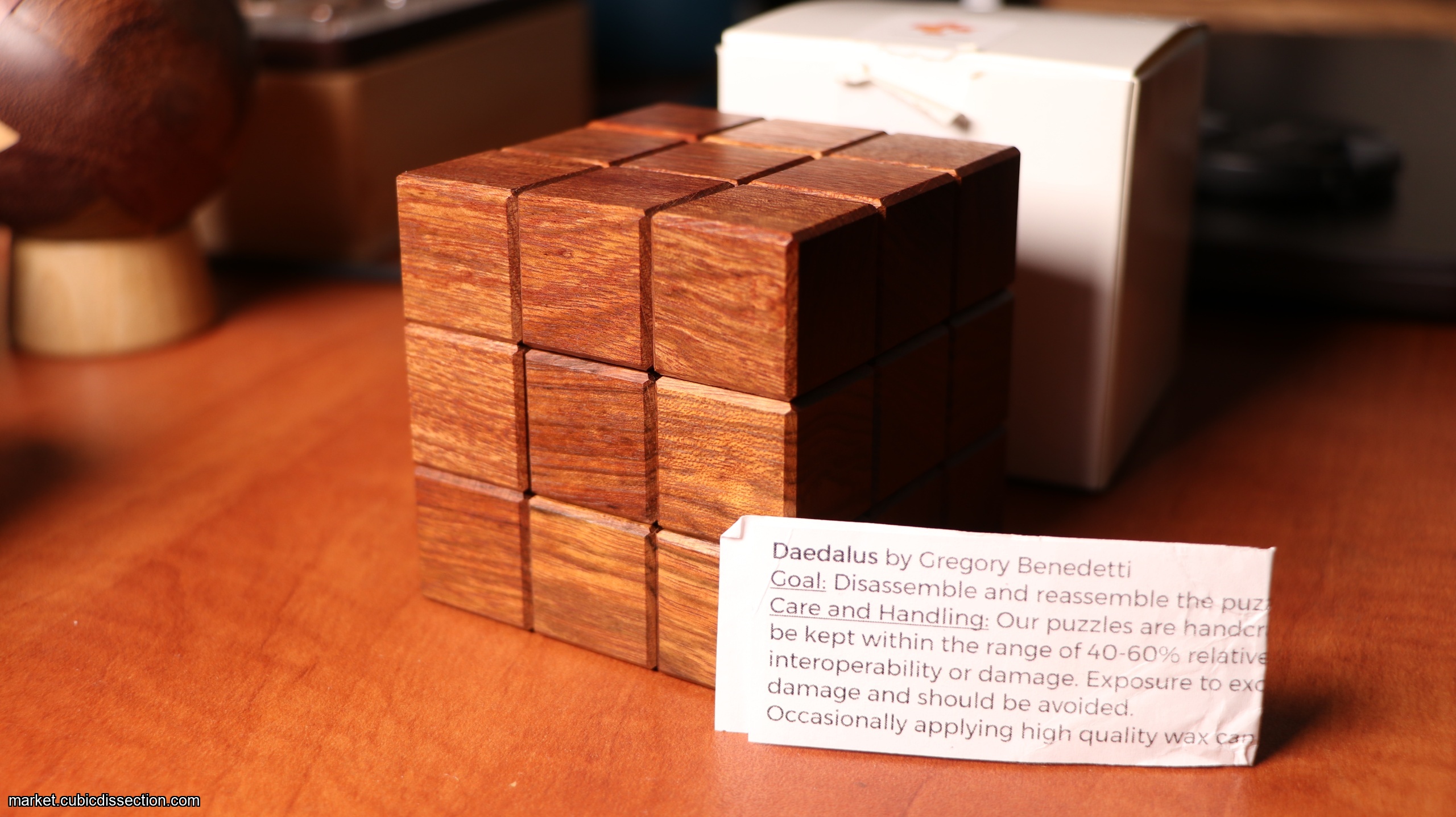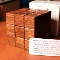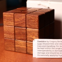 Daedalus by Gregory Benedetti is an utterly unique masterpiece of design. Brilliantly creative and brutally tricky, Daedalus hides its secrets well. The beautiful exterior gives no clue to the sheer pandemonium hiding inside. What appears to be a simple cube is an interlocking maze that continually changes its state with rotations, dead ends, and deception. Simple disassembly is a challenge; reassembly is genuinely an accomplishment.
