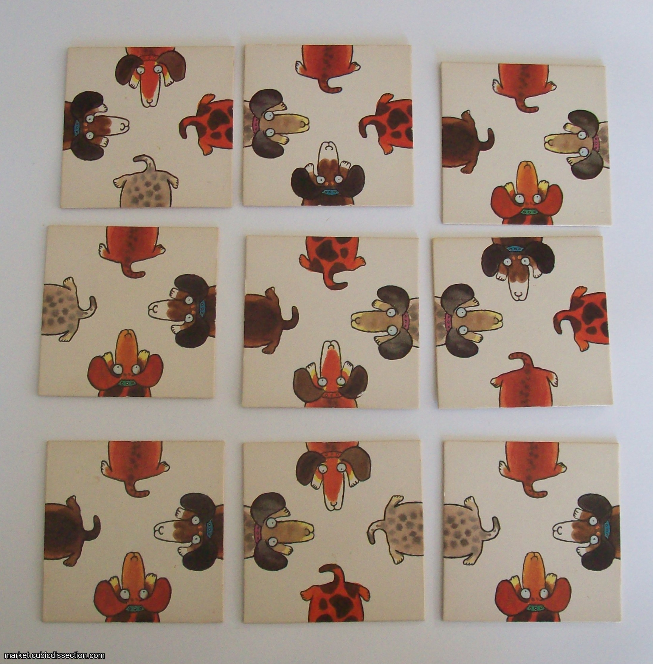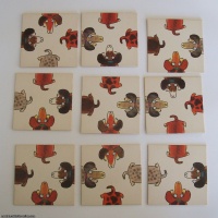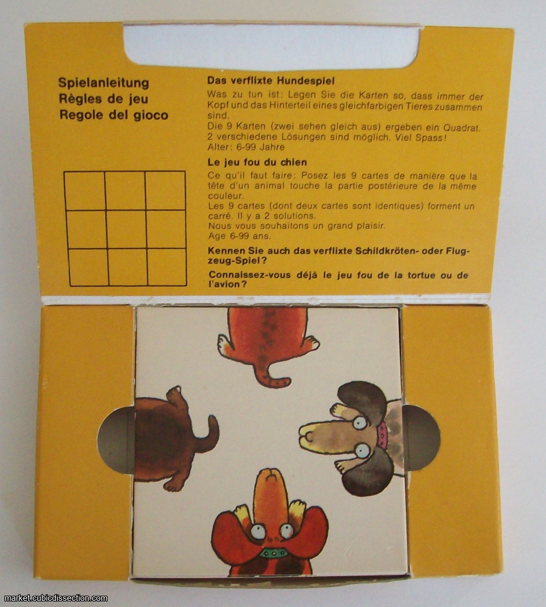 Arrange the cards in such a way that the upper and the lower part of the face in the same color will match. The nine cards must form a square from 3x3 liles.