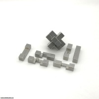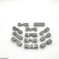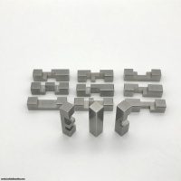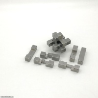 This is a prototype set of pieces for the DDD burr set crafted from aluminum by Bryan Turner. The pieces have the same notching patterns, but are 8 units long instead of the 6 unit production version. This change will prevent some of the possible assembly configurations possible with the production copies. The pieces have no numbers or letter markings on them and are made from 6mm stock, so they will interlock with other pieces from Bryan's 6mm burr piece series, which can be found here: