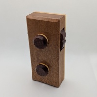 Dial Case is a sequential discovery puzzle that typically requires about 15 moves to open the box, depending on your approach. When you solve the puzzle and open the box, you'll find a message indicating what you should do next. Juno designed this puzzle to be of similar difficulty to our past complex SD puzzles, such as Slammed Car, Sequential Discovery Cubed Box, and Mittan. The perception of difficulty can vary greatly depending on the solver and the content of the puzzle. Some people may solve this puzzle quickly, while others may take much longer compared to other puzzles. Some people may find that this puzzle demands dexterity. If you encounter challenges or find it difficult to manipulate the pieces as desired, try considering if there is a more elegant way to move them. By observing Juno solving the puzzle, you will see that it can be solved smoothly with skillful manipulation. Like many of our other puzzles, it is not necessary to use excessive force, hit the puzzle, or rely on centrifugal force. By solving the puzzle and disassembling the parts for observation, you can understand the mechanisms employed within. The top panel of the puzzle is made of Silky Oak, a distinctive Australian wood with speckled features. The middle layer consists of Fijian Mahogany, while Koto is used for the bottom panel and other parts made of white wood. The dark reddish-brown, hard wood is Jarrah.