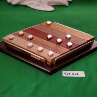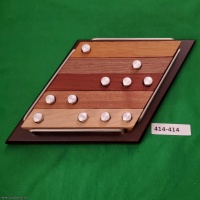 Diamond Eyes consists of 10 pieces (ea a diff exotic wood!!) and 11 aluminum pegs in wood tray form a quadrilateral shape.  Wood tray with aluminum rails.  Goal: fill tray with sticks and pegs.
