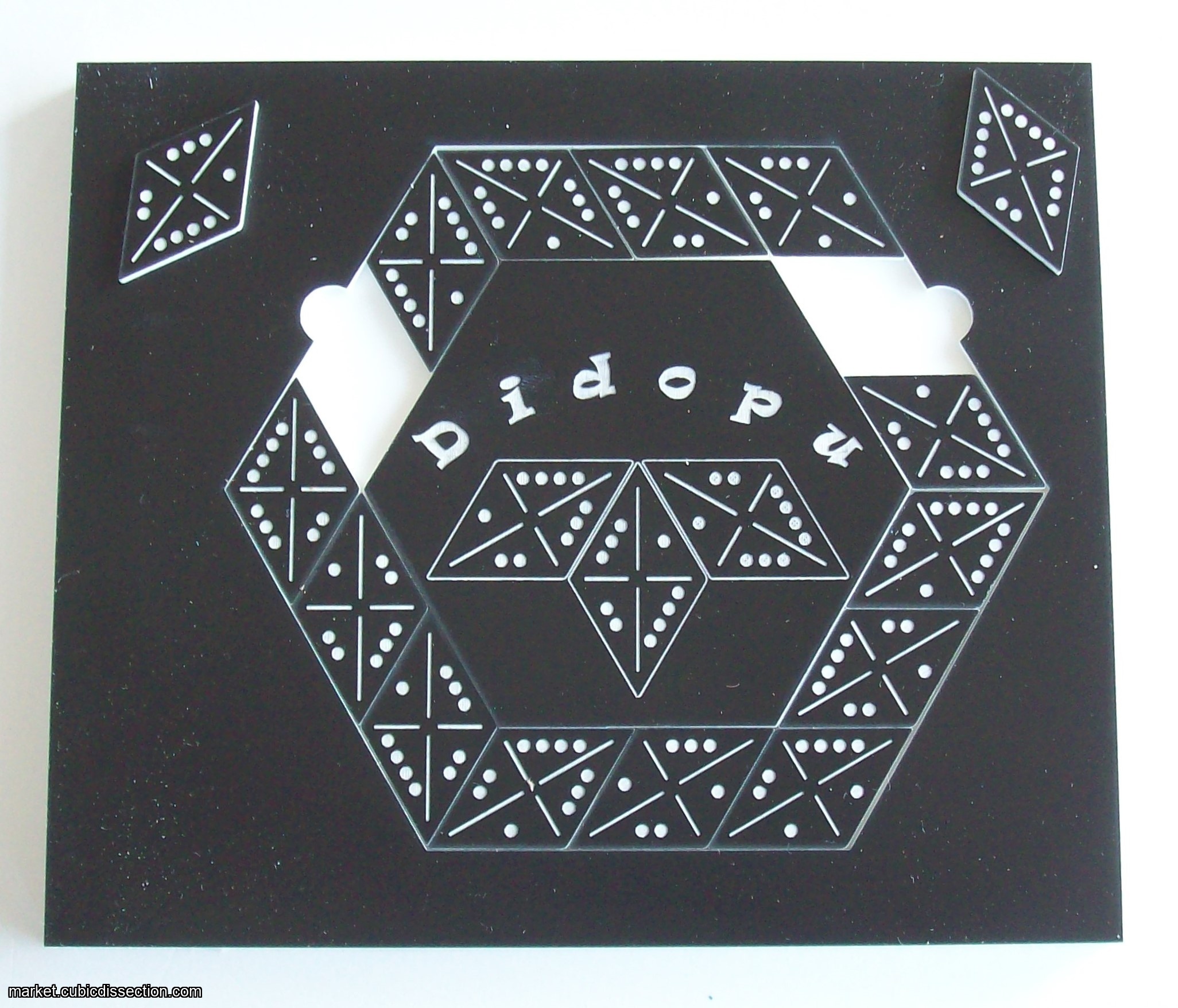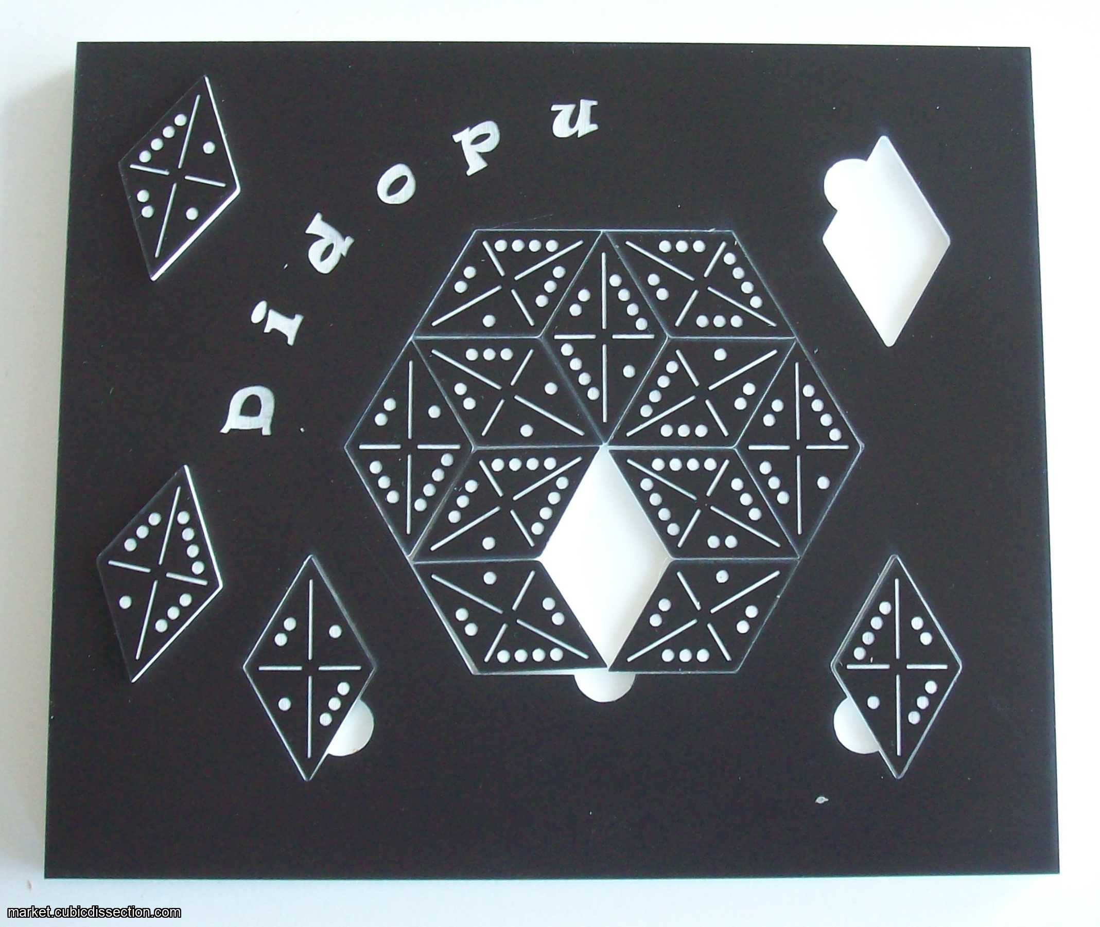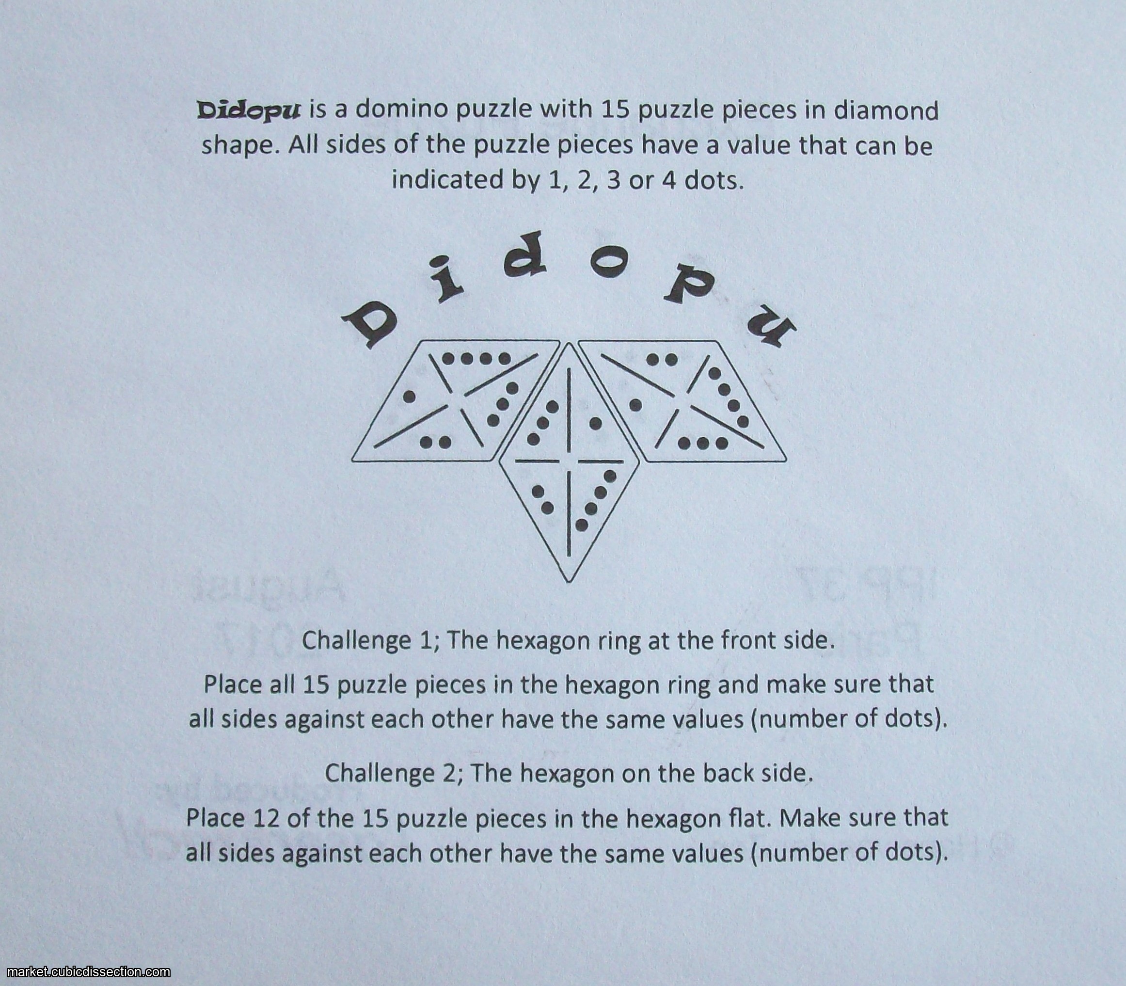 Didopu is a domino puzzle with 15 puzzle pieces in diamond shape. All sides of the puzzle pieces have a value that can be indicated by 1, 2, 3 or 4 dots.