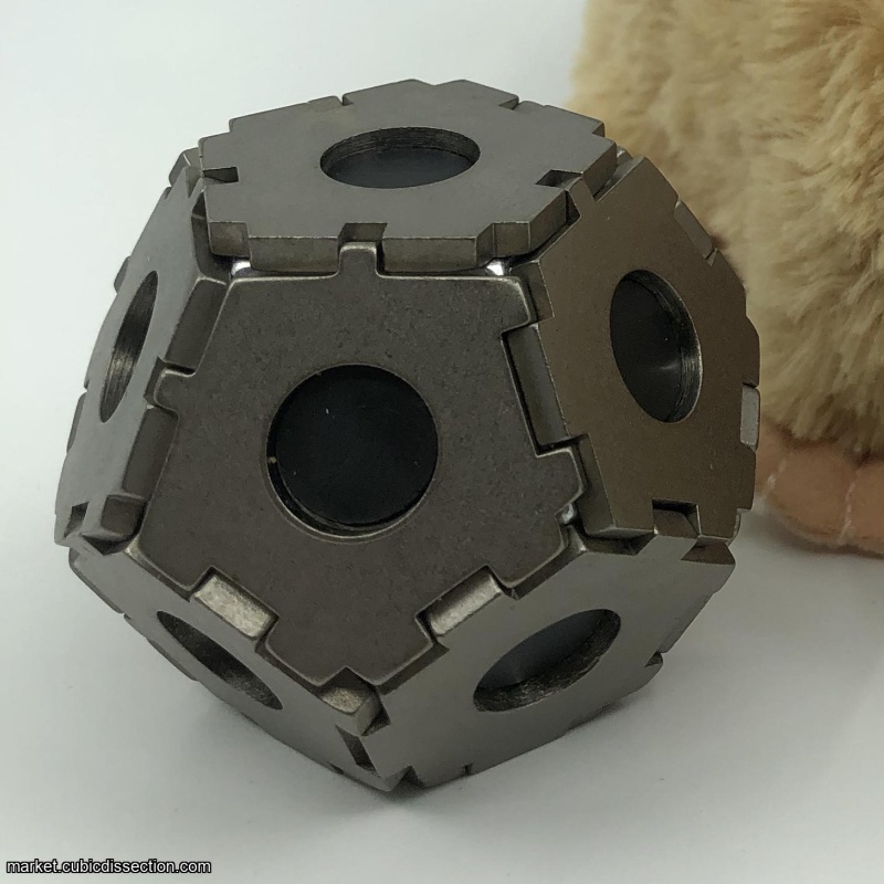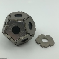 It is an edge matching puzzle and the goal is to attach the 12 steel pentagons to the aluminium core which has a magnet attached to each face. One of the faces on the dodecahedral core has the name of the puzzle "DDH3 MBP7" engraved upon it.