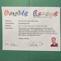 Double Escape is a diabolical and sturdy disentanglement puzzle designed by the late great Markus Götz of Germany, and was Markus' exchange puzzle at the 26th International Puzzle Party (IPP23) held in Boston in 2006.  The goal is to remove the two dark rings from the puzzle.  The solution, as presented by Markus, requires 15 steps!