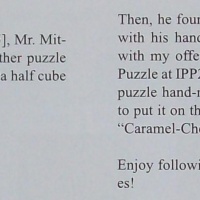 Then, he found it is a very nice puzzle after his evaluation with his hand-made set of puzzle pieces. And, he agreed with my offer to use it as my Edward Hordern Exchange Puzzle at IPP25. This exchange puzzle is pilot version of the puzzle hand-made by Mr. Odawara himself. He has a plan to put it on the market in Japan after IPP25 by the name of