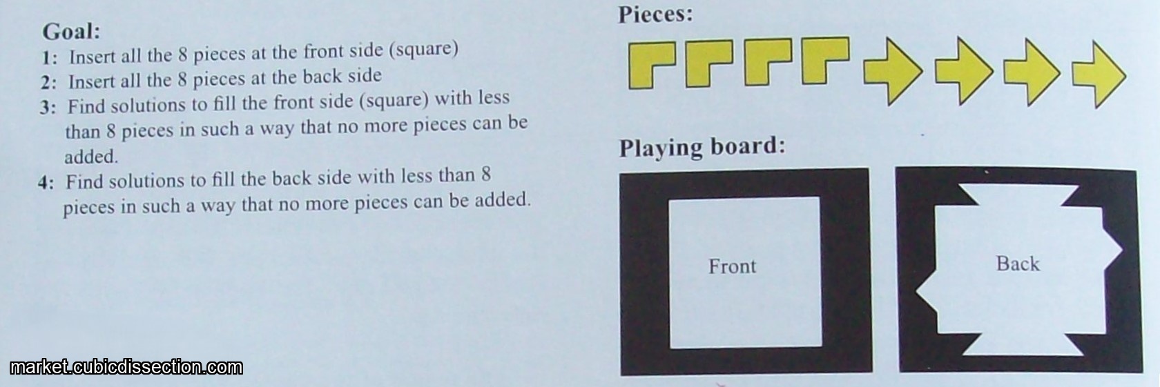 3.  Find solutions to fill the front side (square) with less than 8 pieces in such a way that no more pieces can be added.