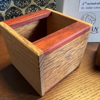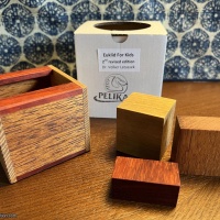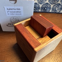 “I was very pleased to receive the Puzzlers' Award and Jury 1st Prize at the Nob Yoshigahara Puzzle Design Competition 2020. EUKLID FOR KIDS with its simple box and only three simple blocks was meant to have an unconventional solution. As children do, the interplay between the blocks and the box was meant to be curiously discovered. In doing so, I had left out a feature of the blocks in order to make the solution easier to see. In the revised edition, I have incorporated this feature. This second edition is for real discoverers. The parts made of padauk and acacia have been swapped to distinguish between the two editions.”